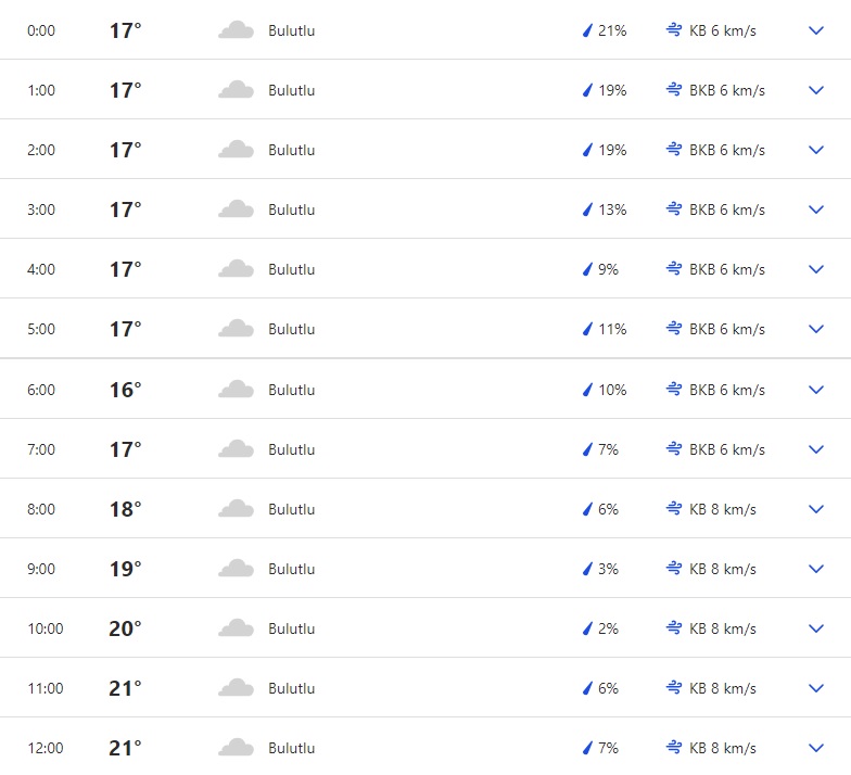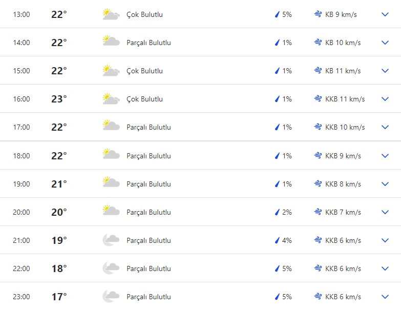 Nem oranı yüzde 66 olacak. Saatlik hava durumu verileri aşağıdadır.