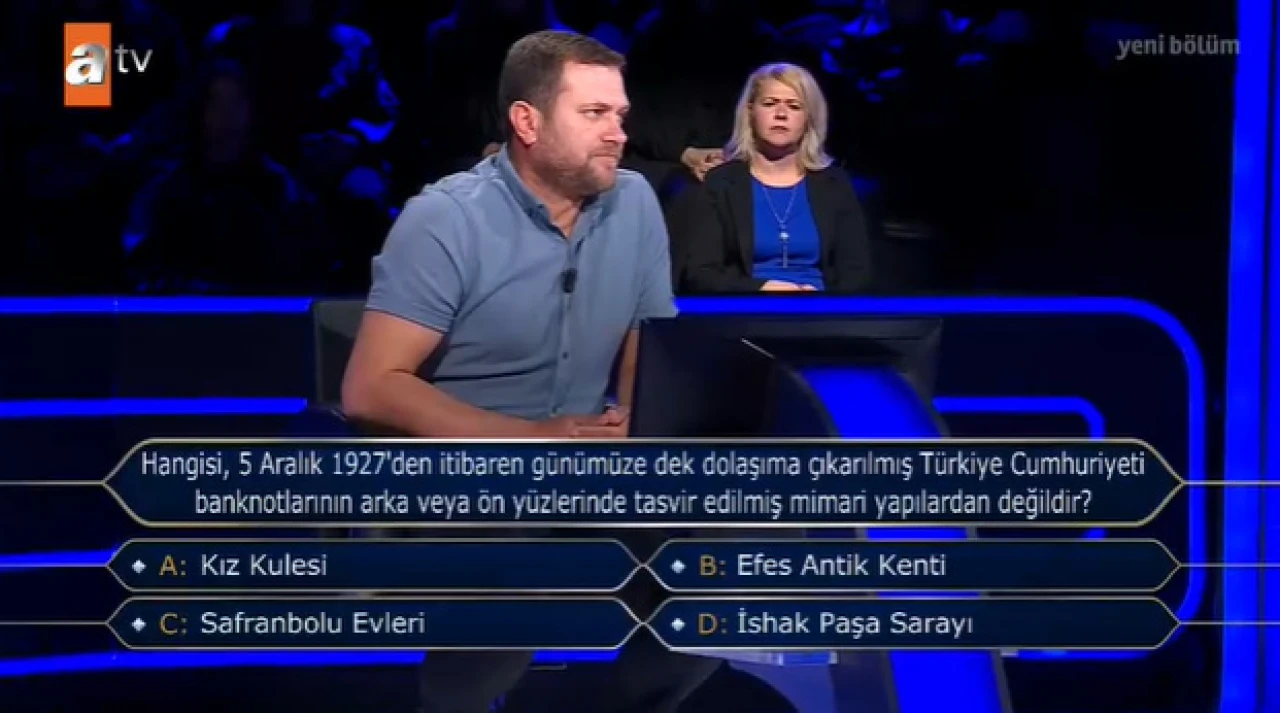 Yarışmanın bu bölümünde, Türkiye Cumhuriyeti banknotlarına dair oldukça ilginç ve bilgi dolu bir soru soruldu. Yarışmacı, 5 Aralık 1927’den günümüze kadar dolaşıma çıkan banknotlarda tasvir edilmiş mimari yapılarla ilgili doğru yanıtı bulmaya çalıştı. İşte o soru, seçenekler ve doğru cevap!