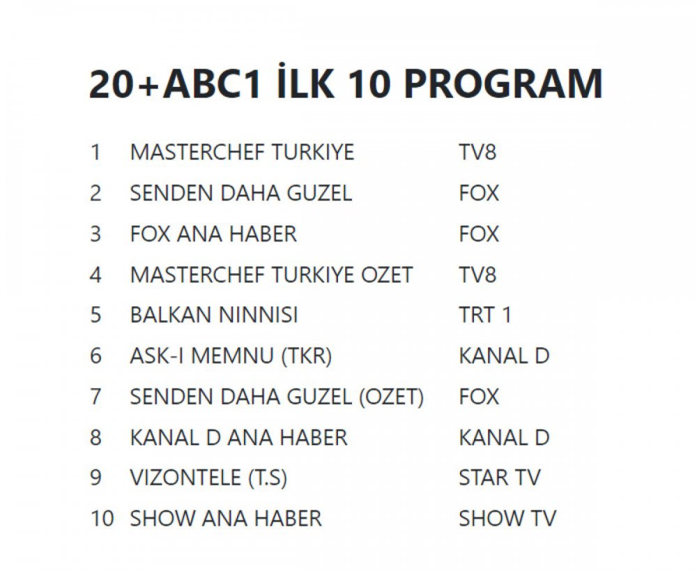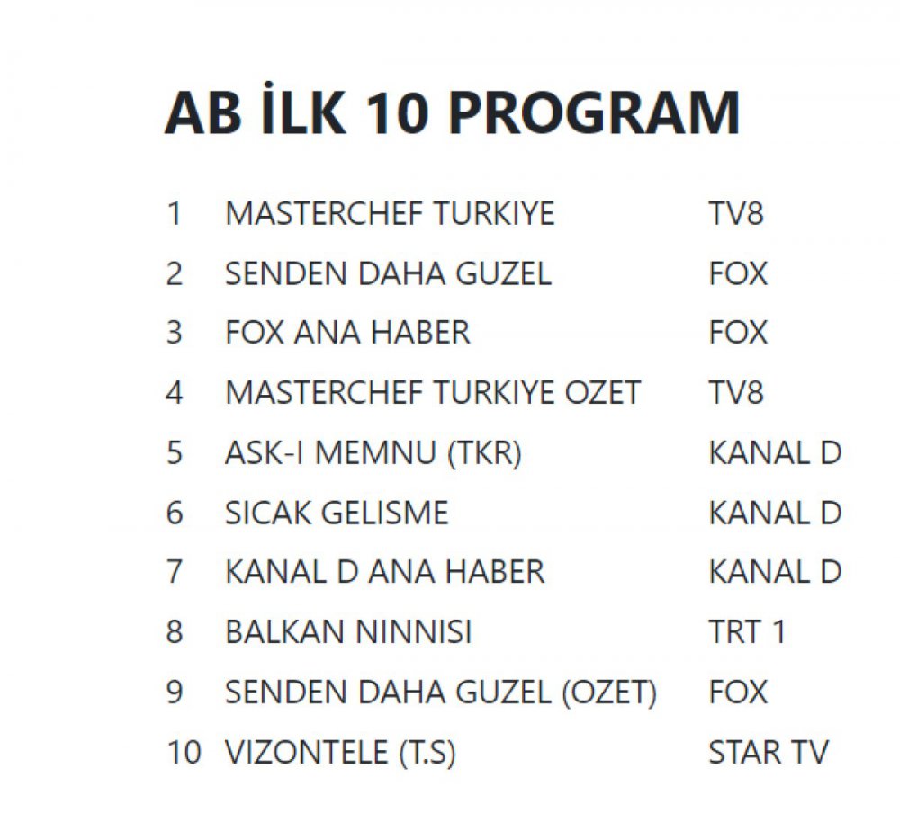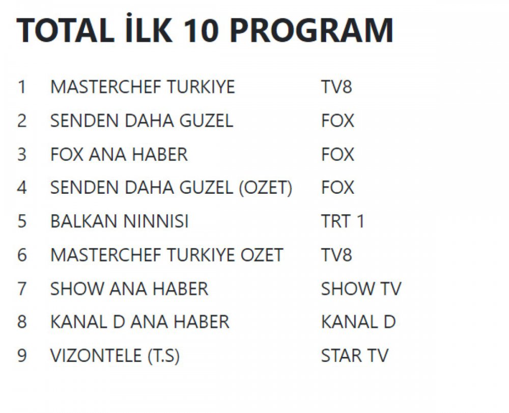 Masterchef, Balkan Ninnisi ve Senden Daha Güzel'in zirve adayı olarak mücadele verdiği reyting sıralamasındaki sonuçların çarşamba sabahı açıklanması bekleniyor. Sıralama belli olur olmaz haberimize eklenecektir.