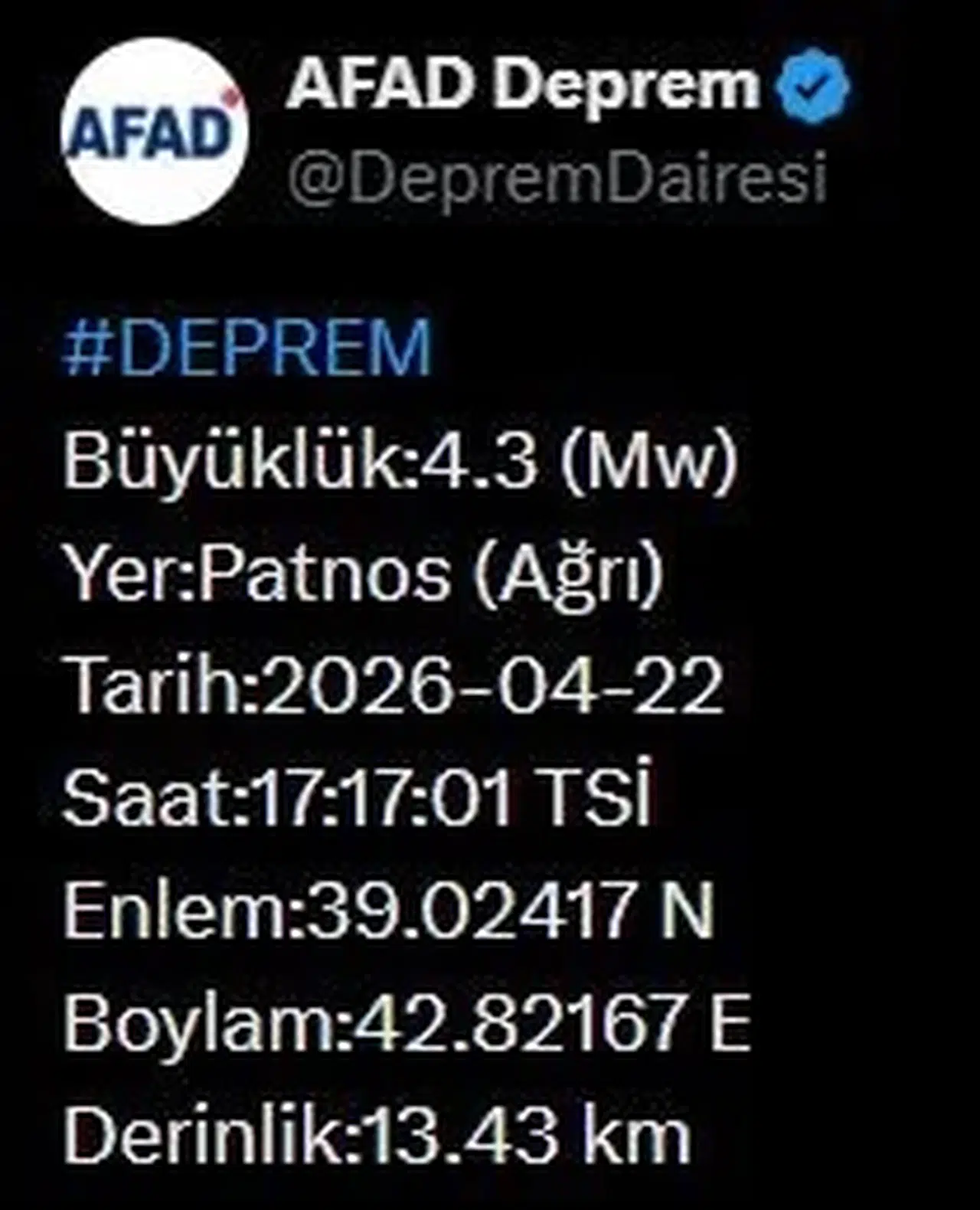 Sarsıntının merkez üssü olarak Patnos işaret edilirken, depremin yerin yaklaşık 13.43 kilometre derinliğinde meydana geldiği saptandı. Bölgedeki vatandaşlar tarafından şiddetli bir şekilde hissedilen deprem, kısa süreli bir endişe dalgası yarattı.