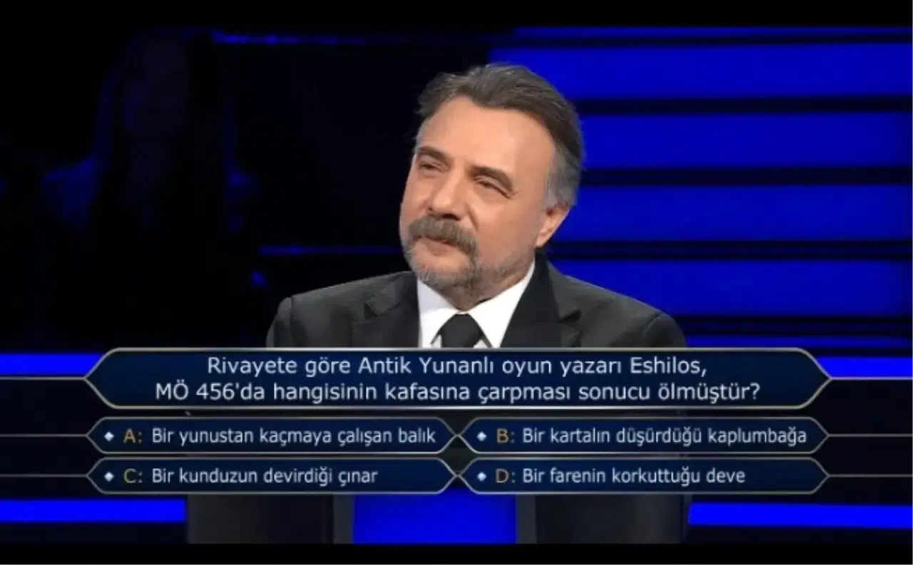 Ekranların en çok izlenen bilgi yarışmalarından biri olan Kim Milyoner Olmak İster, yeni bölümüyle yine gündem oldu. Her bölümde seyirciyi bilgiyle buluşturan yarışmada bu kez Antik Yunan dönemine uzanan ilginç bir soruya yer verildi. Yarışmacıya yöneltilen soruda, ünlü Antik Yunanlı oyun yazarı Aiskhilos’un ölüm nedeni soruldu. İlginç ve bir o kadar trajikomik olan bu sorunun cevabı ise hem yarışmacıyı hem izleyiciyi şaşkına çevirdi.