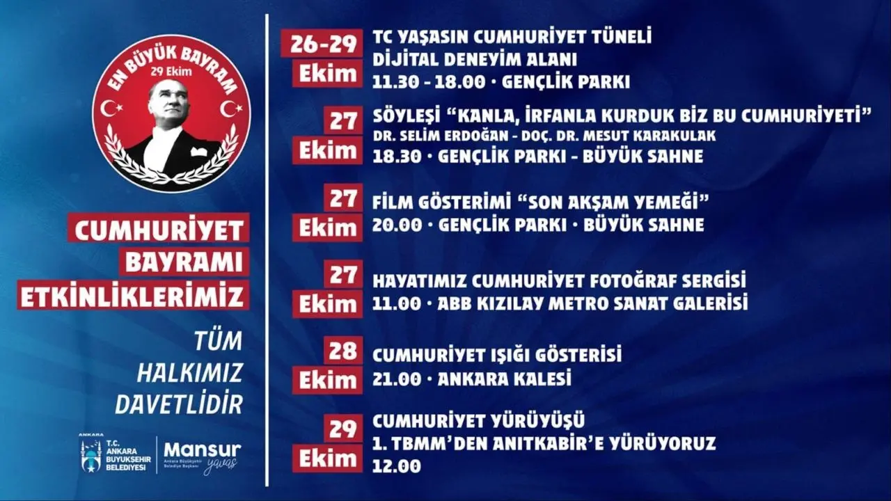 Ankara’da 29 Ekim kutlamaları, resmi tatil öncesinde başlıyor. Ankara Büyükşehir Belediyesi, “Cumhuriyetimizin 101. yıl dönümünü 5 gün sürecek birbirinden farklı etkinliklerle kutluyoruz” sloganıyla etkinlik programını paylaştı. Kutlamalar, 26 Ekim itibarıyla çeşitli sergiler ve söyleşilerle başlayacak ve 29 Ekim'deki Cumhuriyet Yürüyüşü ile taçlanacak.
