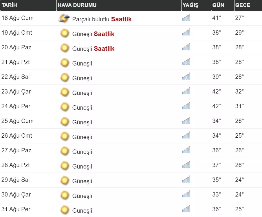 Antalya'da Meteoroloji tarafından alınan verilere göre 15 gün boyunca hava güneşli olacak. İl genelinde sıcaklık en çok 42 dereceyi görürken genel olarak 35-38 derece arasında sıcaklık ölçülecek. Akşam saatlerinde sıcaklık 25 derecelere kadar gerilemesi bekleniyor.