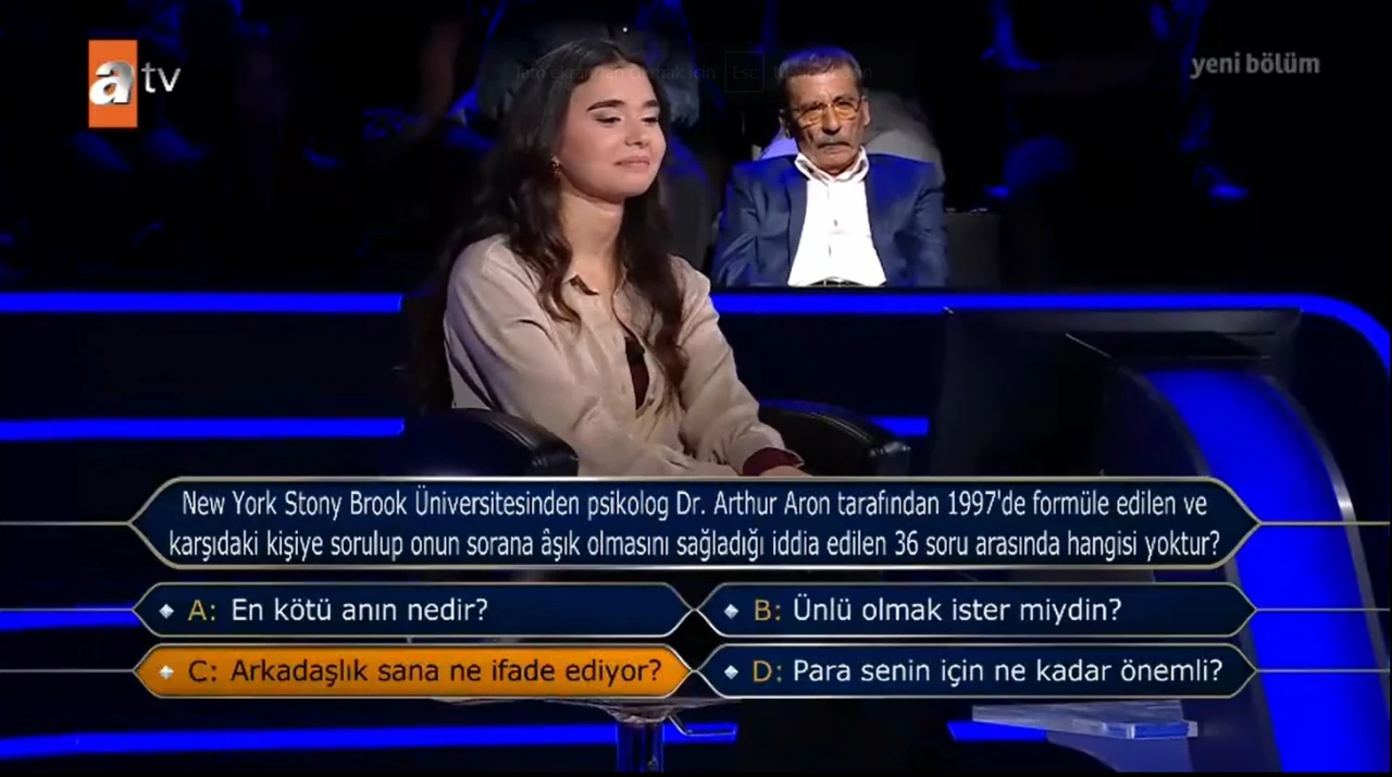 Kim Milyoner Olmak İster yarışmasında Pazar akşamı sorulan "Arthur Aron 1997 yılında formüle edilen 36 soru arasında hangisi yoktur? " sorunun yanıtı ekranları başındaki seyirciler tarafından merak ediliyor. Peki sorunun doğru cevabı nedir?