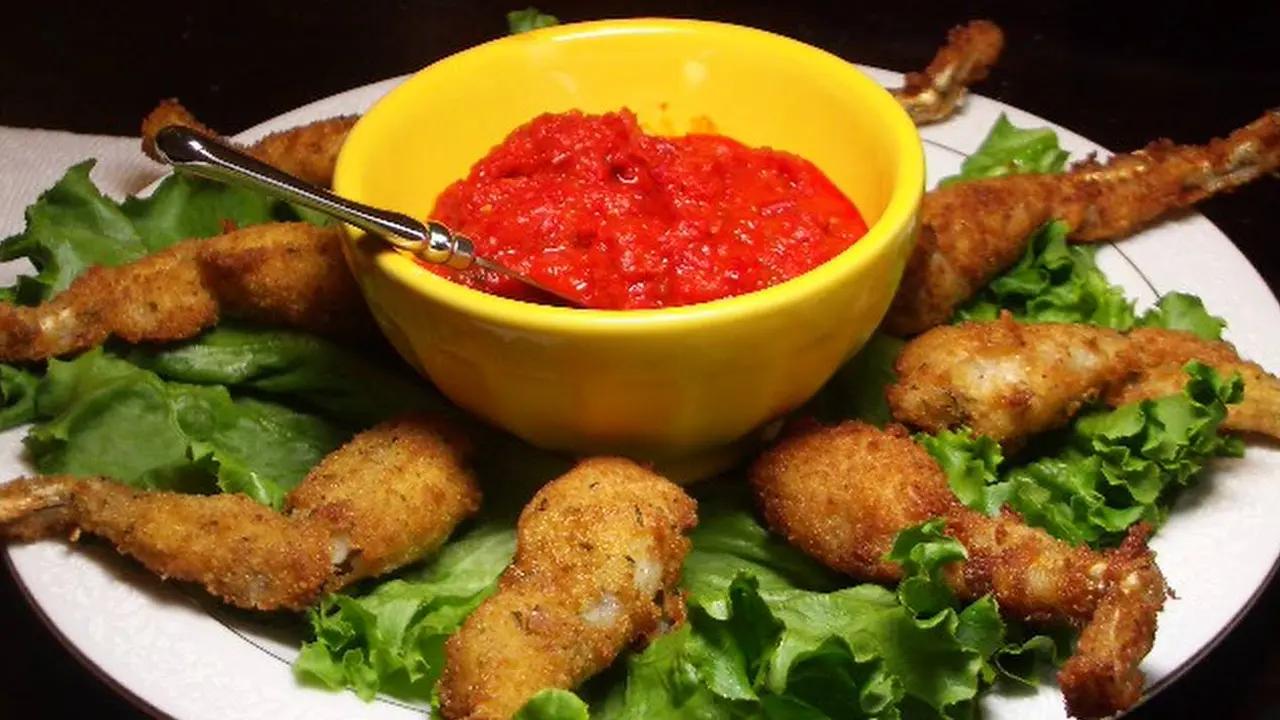 Bacakları keskin bir bıçakla tek tek ayırın. Tuzla iyice yıkayın, eti soğuk su altında ovalayın. Acı sos ve limon suyunu kasede birleştirin. Bacakları gece boyunca marine edin.
