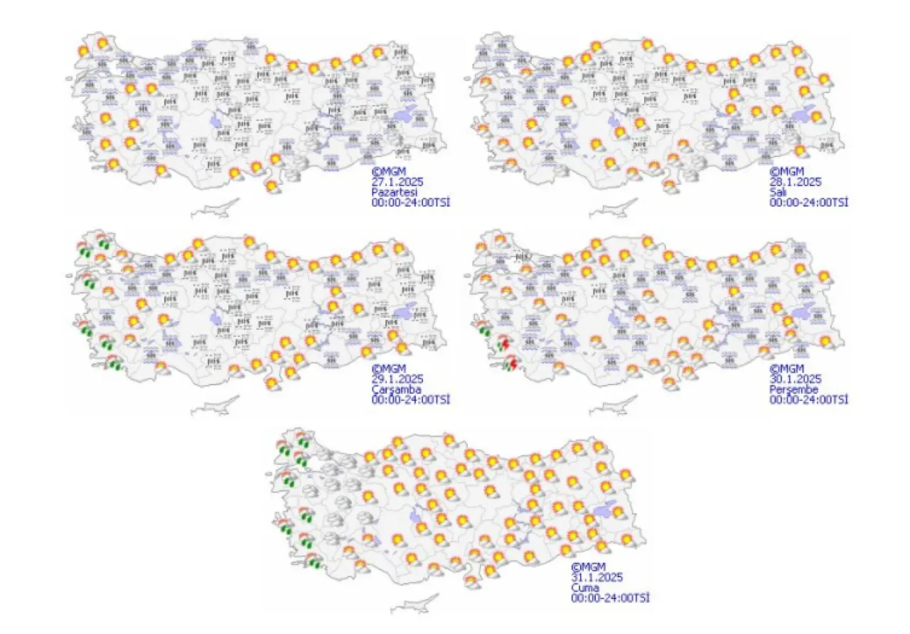Sıcaklıklar mevsim normallerinde, yurdun batı kesimlerinde birkaç derece üzerinde seyrediyor. Yeni haftanın ilk birkaç günü yağış beklenmiyor.