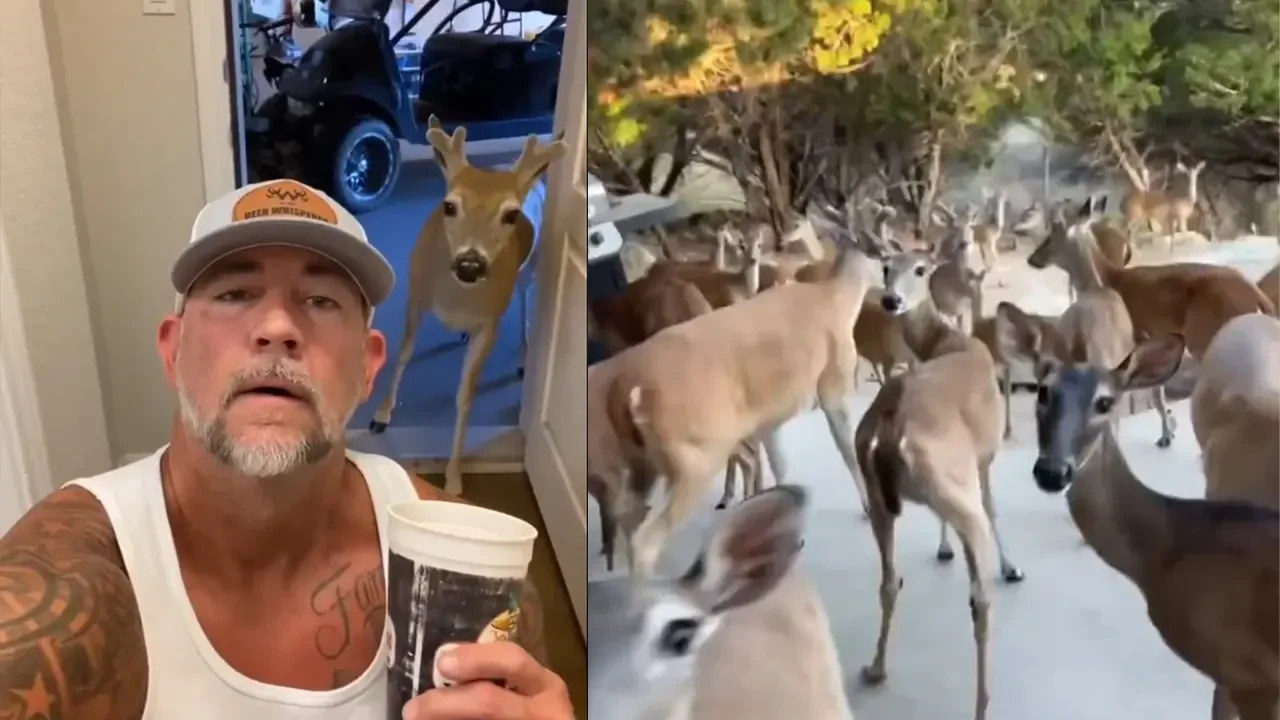 Bir yandan dinlenen adam, evine gelen davetsiz misafirin açlığını mısır gevreği ile gidermeye çalıştı. O sırada evinden dışarı çıkan ev sahibi gördükleri karşısında şoke oldu. Yavru geyik eve geldiğinde beraberinde çok sayıda geyiği de getirdi. Evin bahçesi geyiklerle doldu. Ev sahibi yaşadığı o anları saniye saniye kaydetti.