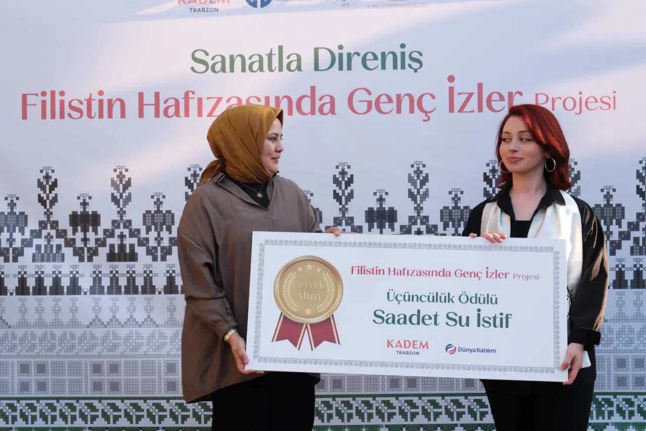 KADEM Trabzon Temsilcisi Elif Yükünç ise törende yaptığı konuşmada projeye emek veren gençlere teşekkür ederek, “Sanatla Filistin’e umut taşıyan bu projeyi tamamlamanın gururunu yaşıyoruz. Sessizliğe karşı en güçlü ses, vicdan ve sanattır” dedi.