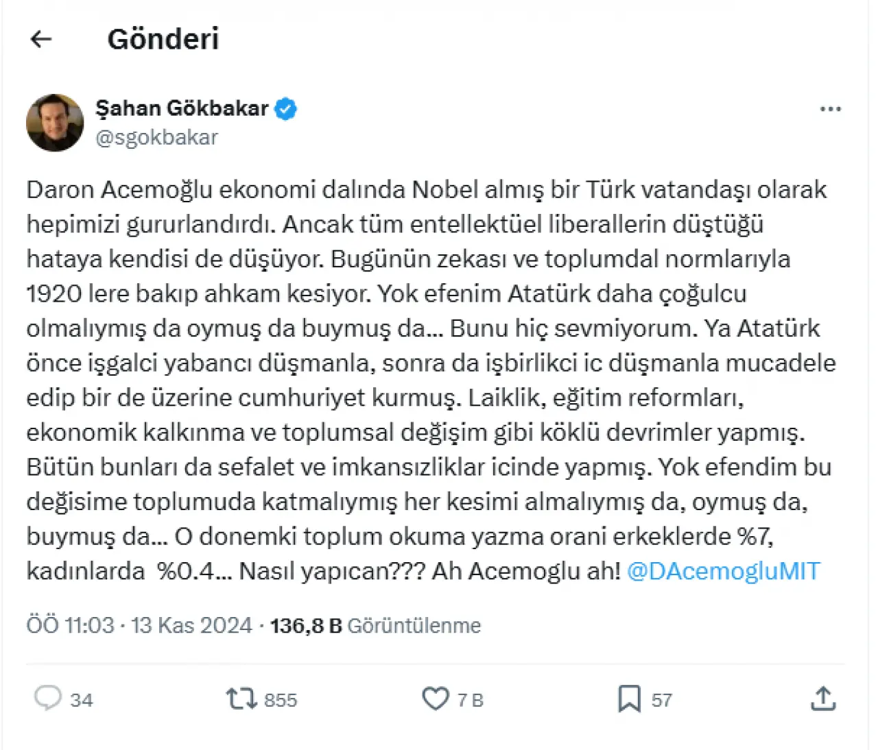 “Daron Acemoğlu ekonomi dalında Nobel almış bir Türk vatandaşı olarak hepimizi gururlandırdı. Ancak tüm entellektüel liberallerin düştüğü hataya kendisi de düşüyor. Bugünün zekası ve toplumsal normlarıyla 1920’lere bakıp ahkam kesiyor. Yok efenim Atatürk daha çoğulcu olmalıymış da oymuş da buymuş da... Bunu hiç sevmiyorum. Ya Atatürk önce işgalci yabancı düşmanla, sonra da işbirlikçi iç düşmanla mücadele edip bir de üzerine cumhuriyet kurmuş.”