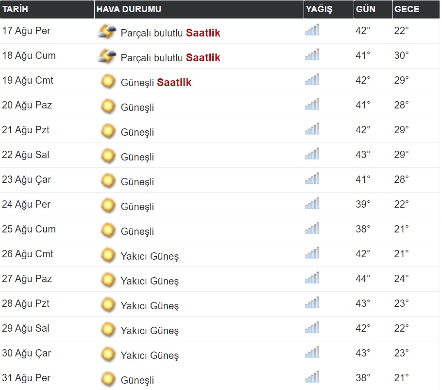 Diyarbakır 15 günlük hava durumu 17-31 Ağustos 2023