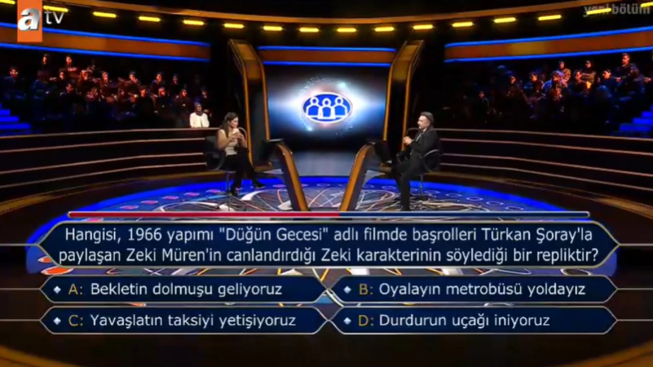 Kim Milyoner Olmak İster'in 8 Aralık 2024 tarihli bölümünde, Türk sinema tarihinin efsane isimleri Zeki Müren ve Türkan Şoray'ın başrollerini paylaştığı 1966 yapımı "Düğün Gecesi" filmine dair bir soru gündem oldu. Yarışmacıya, filmde Zeki karakterinin söylediği replik soruldu ve bu soru büyük ilgi topladı. İşte detaylar ve cevabı...