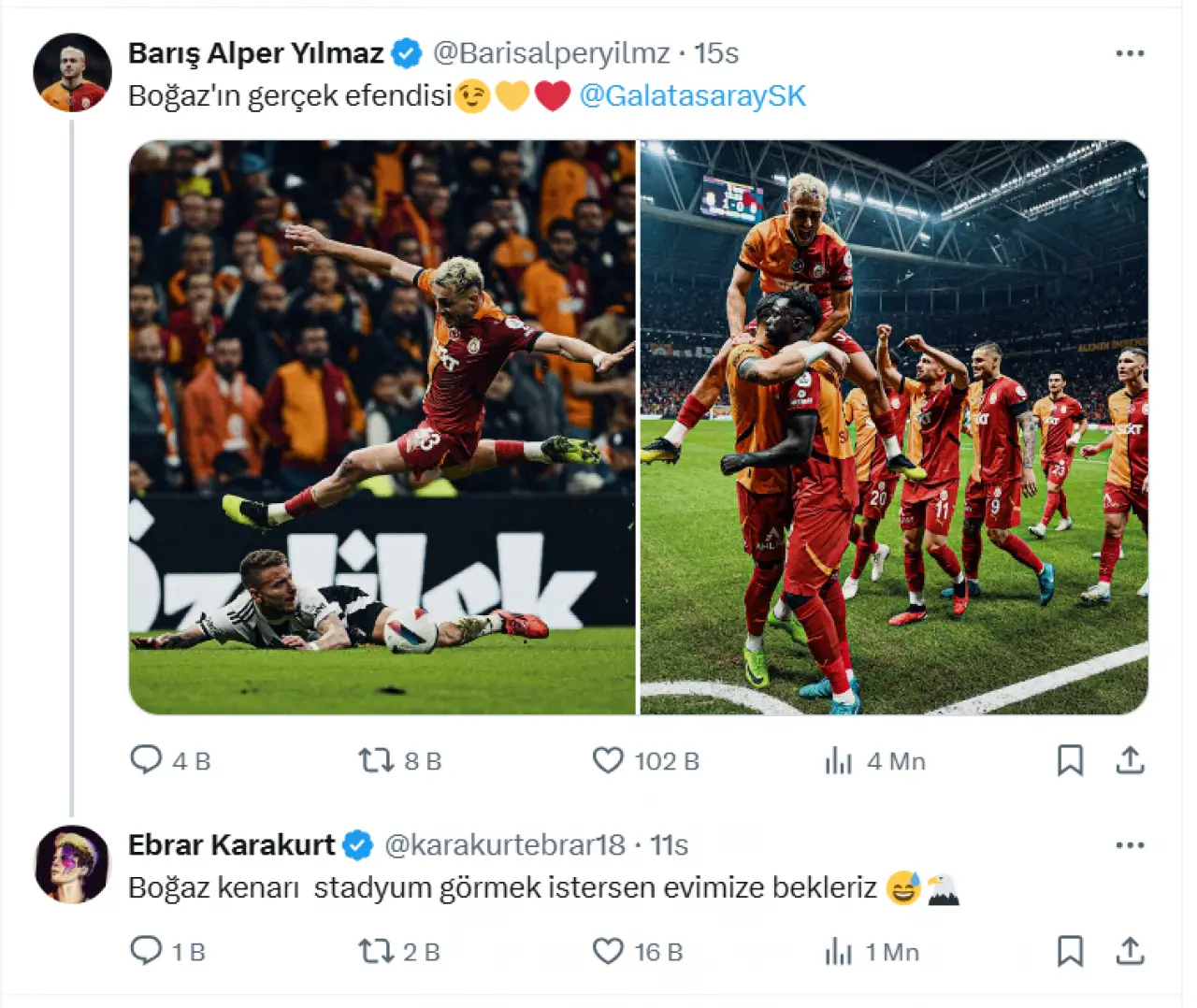 Galatasaray’ın ve Milli Takım’ın yıldız futbolcusu Barış Alper Yılmaz, Beşiktaş’ı RAMS Park’ta 2-1 mağlup ettikleri maçın ardından kişisel X hesabından bir paylaşımda bulundu. Maçtan karelerle birlikte duygularını kelimelere döken Yılmaz mesajındai, “Boğaz'ın gerçek efendisi” ifadesini kullandı.