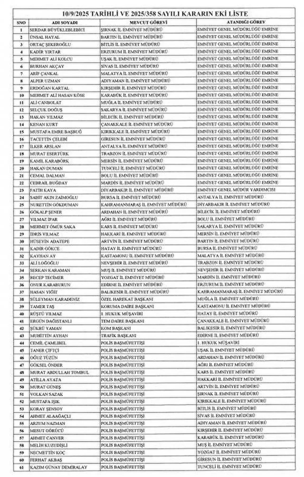 Cumhurbaşkanlığı tarafından yayımlanan yeni kararname ile Türkiye genelinde emniyet teşkilatında büyük çaplı bir değişiklik gerçekleştirildi. 22 ilin emniyet müdürü merkeze alınırken, 37 ile yeni emniyet müdürleri atandı. Söz konusu kararname, 11 Eylül 2025 Perşembe günü Resmî Gazete’de yayımlanarak yürürlüğe girdi.