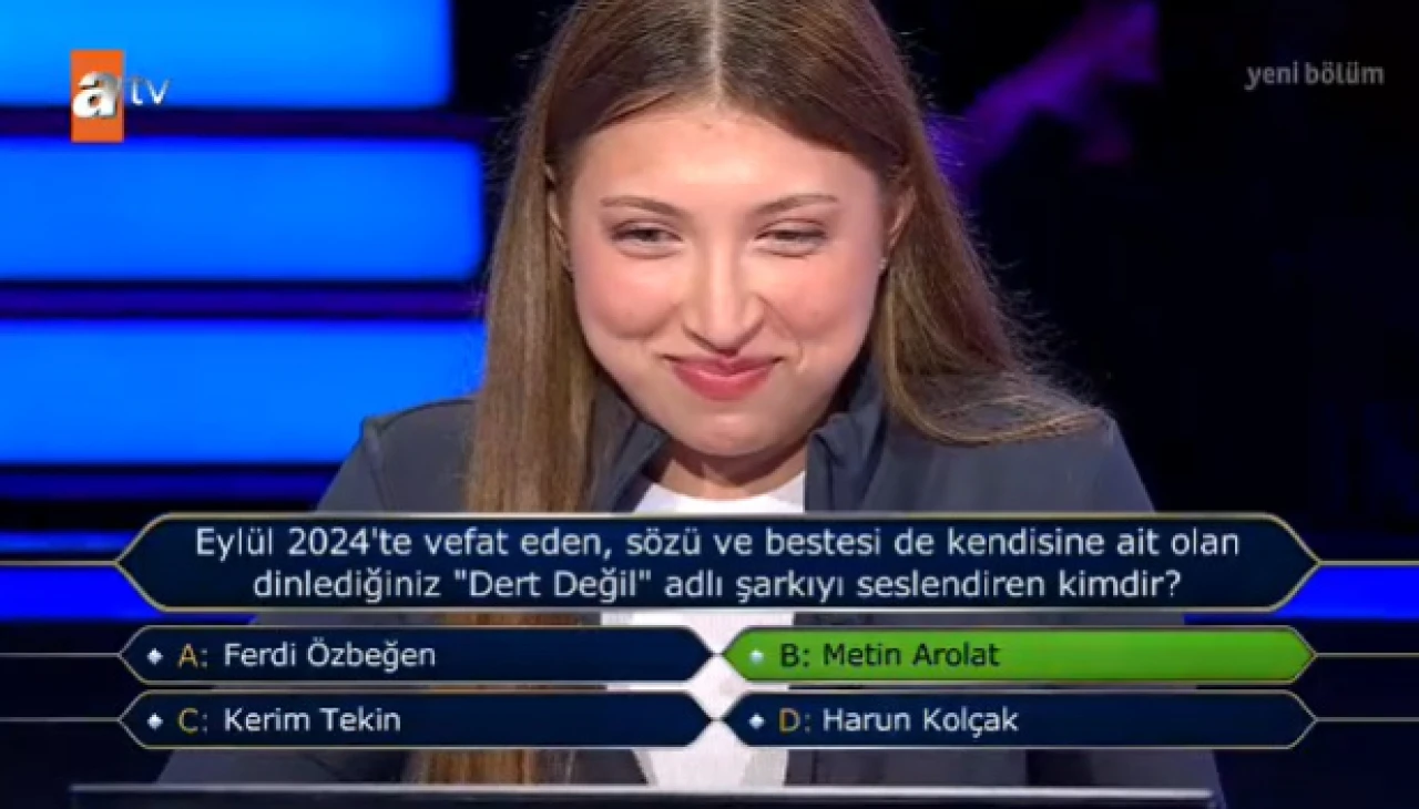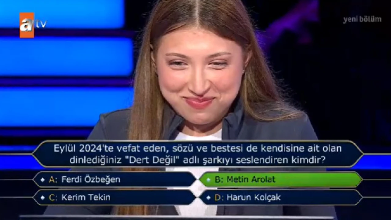 Kim Milyoner Olmak İster’de bu hafta, Türk müziğine dair bir soru dikkat çekti. Yarışmacıya yöneltilen soruda, "Eylül 2024’te vefat eden, sözü ve bestesi de kendisine ait olan 'Dert Değil' adlı şarkıyı seslendiren kimdir?" diye soruldu. Yarışmacı, doğru cevabı bulmaya çalışırken heyecan dolu anlar yaşandı. Ancak sorunun doğru yanıtını bilmek, hem izleyiciler hem de yarışmacı için düşündürücü bir deneyim oldu.