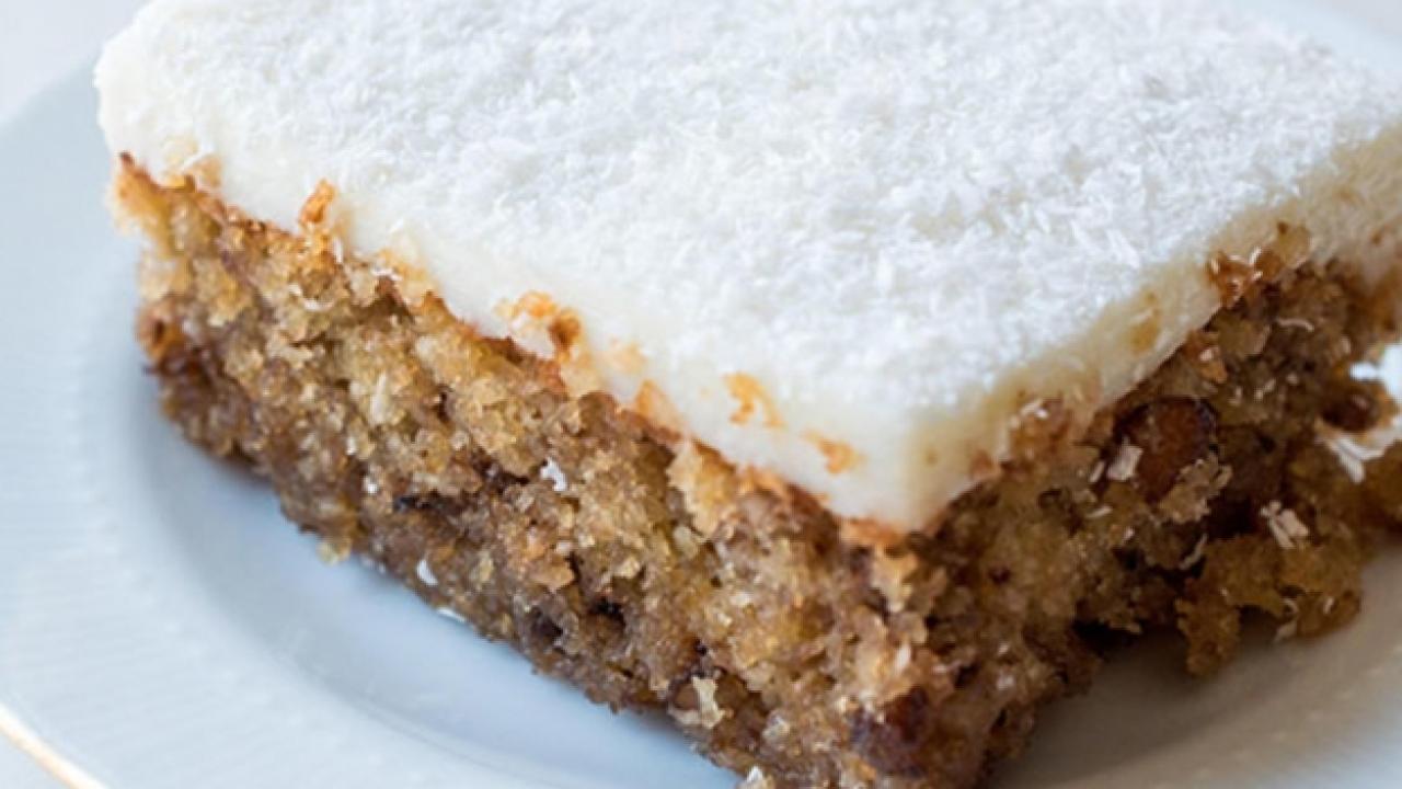 Önceden ısıtılmış 200 derecelik fırında 30 dakika pişirin. Fırından çıkarıp kenarda ılıtın. Soğumuş şerbeti üzerine dökün. Kreması için Süt, nişasta, un, vanilya ve şekeri bir tencerede pişirin. Kaynadıktan sonra kenara alın. Soğuduktan sonra çırpılmış kremayı ilave edip yavaşça birbirine yedirin. Kremayı şerbetli tatlının üstüne sürün. Üzerine Hindistan cevizi ve ceviz serpip servis edin.