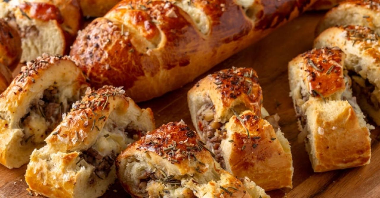 Hamurunuzu 3 eşit parçaya bölün. Ardından hamurlarınızı uzun diklemesine açın. İçerisine hazırladığınız kıymalı harcı yayın. Üzerine dilimlediğiniz kaşar peynirini yayın. Hamurun kenarlarını iyice kapatın ve birbirlerine iyice bastırın. Ardından hamurunuzun kapattığınız kısmını alta alıp, fırın tepsinize alın. Bir makas yardımıyla üzerinde çentikler açın. Üzerlerine yumurta sarısı sürün ve aralarına küp doğranmış kaşar peyniri ilave edin. Üzerlerine ince kıyılmış biberiye, pul biber ve deniz tuzu serpiştirin ve 10 – 15 dakika tepsi mayalamasına bırakın. 180 derecede önceden ısıtılmış fırında 25 dakika pişirin.