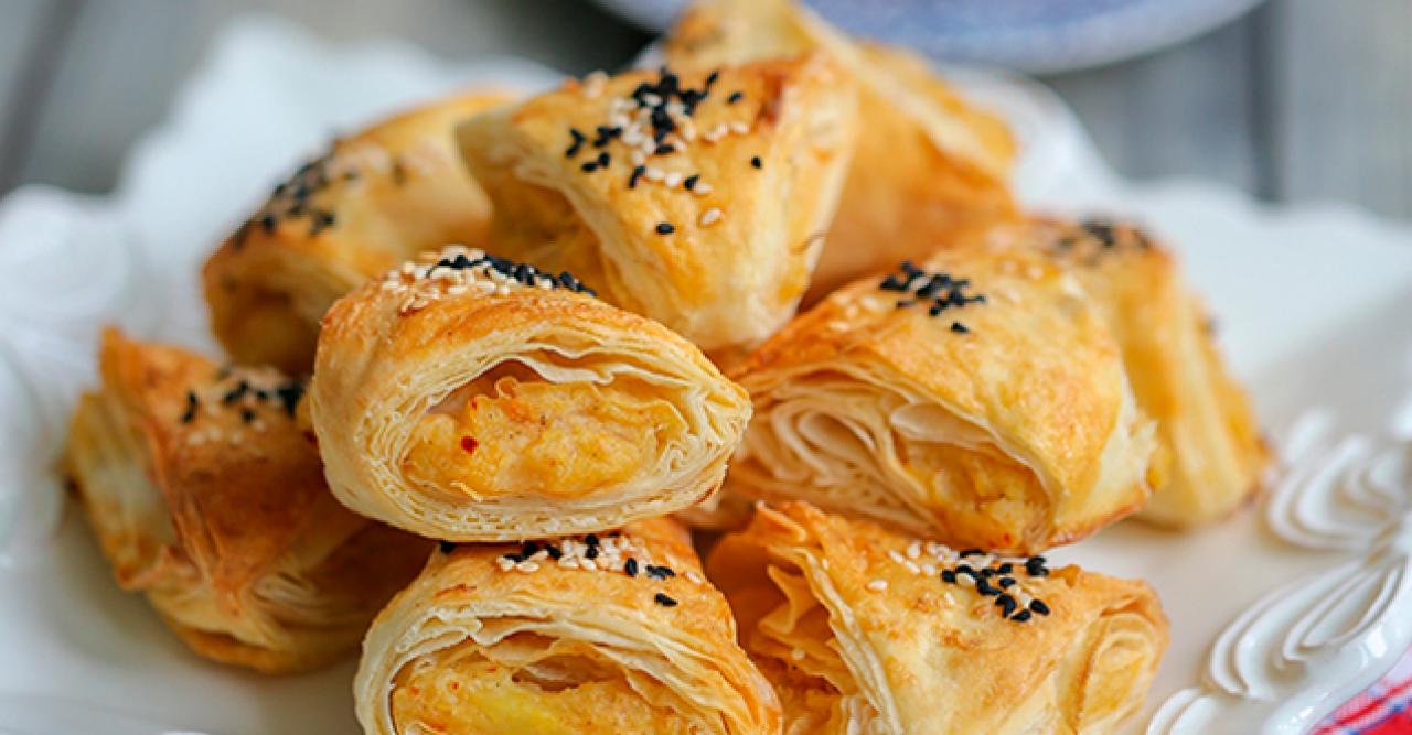 İç harcı için patatesleri soyun ve haşlayın. Haşlanmış patatesleri rendeleyin. Soğanı yemeklik doğrayın ve Sana Tereyağı Lezzetiyle tencereye alın. Orta ateşte soğan pembeleşince patatesleri ekleyin, tuz, karabiber ve pul biberi ekleyerek karıştırın. 1 Dakika kadar kavurup ocaktan alın. Yufkayı tezgaha serin ve üstüne fırça yardımıyla erittiğiniz yağı sürün. Yağın üstüne bir süzgeç yardımıyla nişasta serpin. 2. Yufkayı ilkinin üstüne serin ve aynı işlemi uygulayın. Son yufkayı da serin ve soslayıp nişasta serpin. Hazırladığınız patatesli harcı yufkanın her iki ucuna yatay olarak bir şerit halinde yayın. Yufkayı iki ucundan ortaya doğru kıvırın ve ortadan bıçak yardımıyla bölün. Üçgen şeklinde dilimleyin, üstlerine yumurta sarısı sürün ve susam serperek 180 derece önceden ısıttığınız fırında kzıarıncaya kadar pişirin. Ilık ya da soğuk servis yapın.