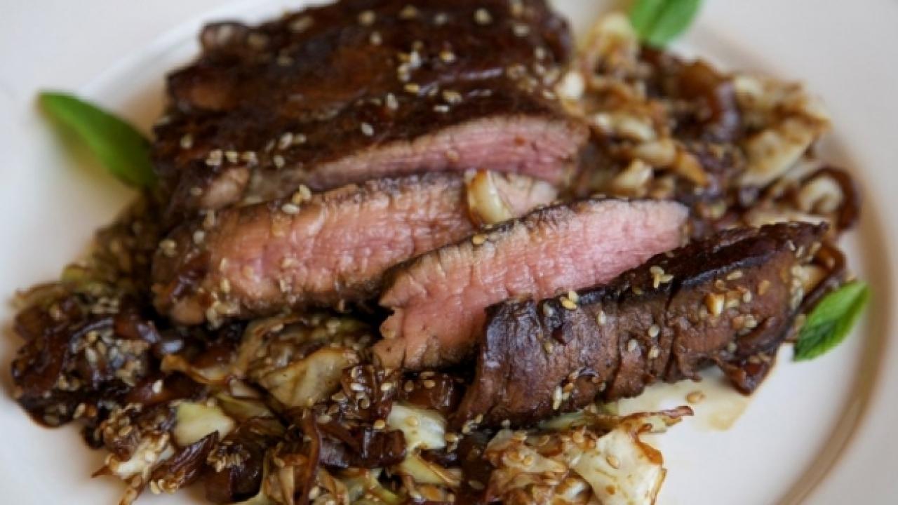 Tarife önce etlerin marinasyonu ile başlayın. 3 parmak kalınlığında 3 dilim bonfile için, 3 çorba kaşığı pekmezi dökün ve çatalın ucu ile delikler açın ki pekmezi iyice içine alsın. 6 diş sarımsağı incecik doğrayın ve marine sosa ekleyin. Orta yükseklikte ateşte 3 çorba kaşığı zeytinyağı tavaya dökün. 2 tarafını toplamda 4 dakika kadar pişirip, eti mühürleyin ve bir tabağa alın. Tabağı alüminyum folyo ile kaplayın, böylece kendi ısısında dinlenecektir. Eti pişirdiğiniz tavaya 1 çorba kaşığı daha zeytinyağı ilave edin ve ince doğranmış 3 su bardağı kadar lahanayı ekleyin ve kendilerini bırakana kadar pişirin. 2 adet soğanı ortadan bölüp, ince halkalar yapacak şekilde doğrayın ve lahanaya ekleyin. Soğanlar iyice öldükten sonra 2 çorba kaşığı susamı yemeğe çıtırtı katması için ekleyin. Etleri tavaya alın, isteğinize göre tuz ve 1 tatlı kaşığı kadar karabiberi ekleyin ve hepsini iyice karıştırın. Geriye kalan lahana ve soğanların iyice ölmesini ve etimizin orta pişmiş bir hal almasını sabırsızlıkla beklemek!