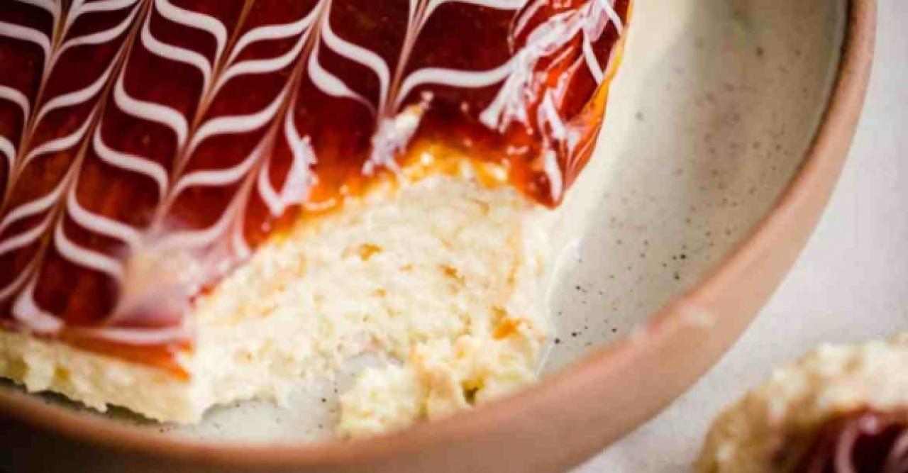 Krem şantiyi krema torbasına koyun ve kekin üzerine birkaç cm aralıklarla dikey çizgiler çekin. Ardından, çizgileri elde etmek için bir kürdan kullanarak yatay yönde sürükleyin. Yemeğin üzerine streç film koyun ve bir gece buzdolabında bekletin. Bu kek en iyi buzdolabından çıkar çıkmaz servis edilir.