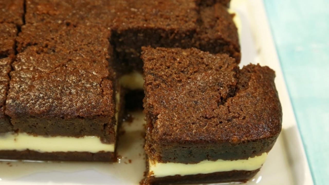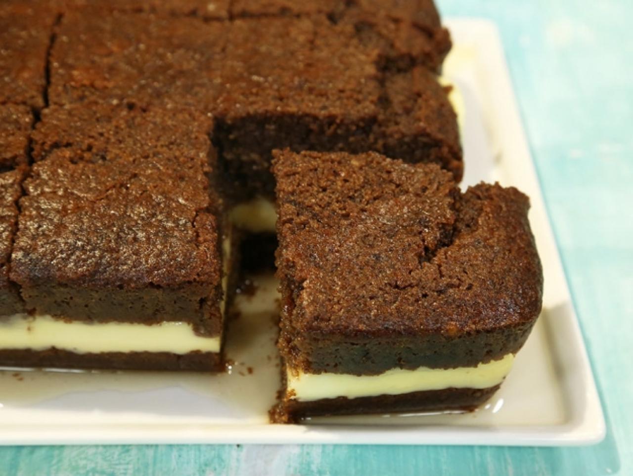 Kek piştikten sonra kağıdı ile beraber kabından çıkartın. 5-6 dakika bekletin ve keki enine ortadan ikiye bölün. Alt katı fırın kabına tekrar alın. Şerbetin bir kısmını üzerine dökün. Muhallebiyi karıştırıp kekin üzerine gezdirin ve kalan diğer kek parçasını muhallebinin üzerine koyun. Dilimleyip şerbetin kalanını üzerine dökün.