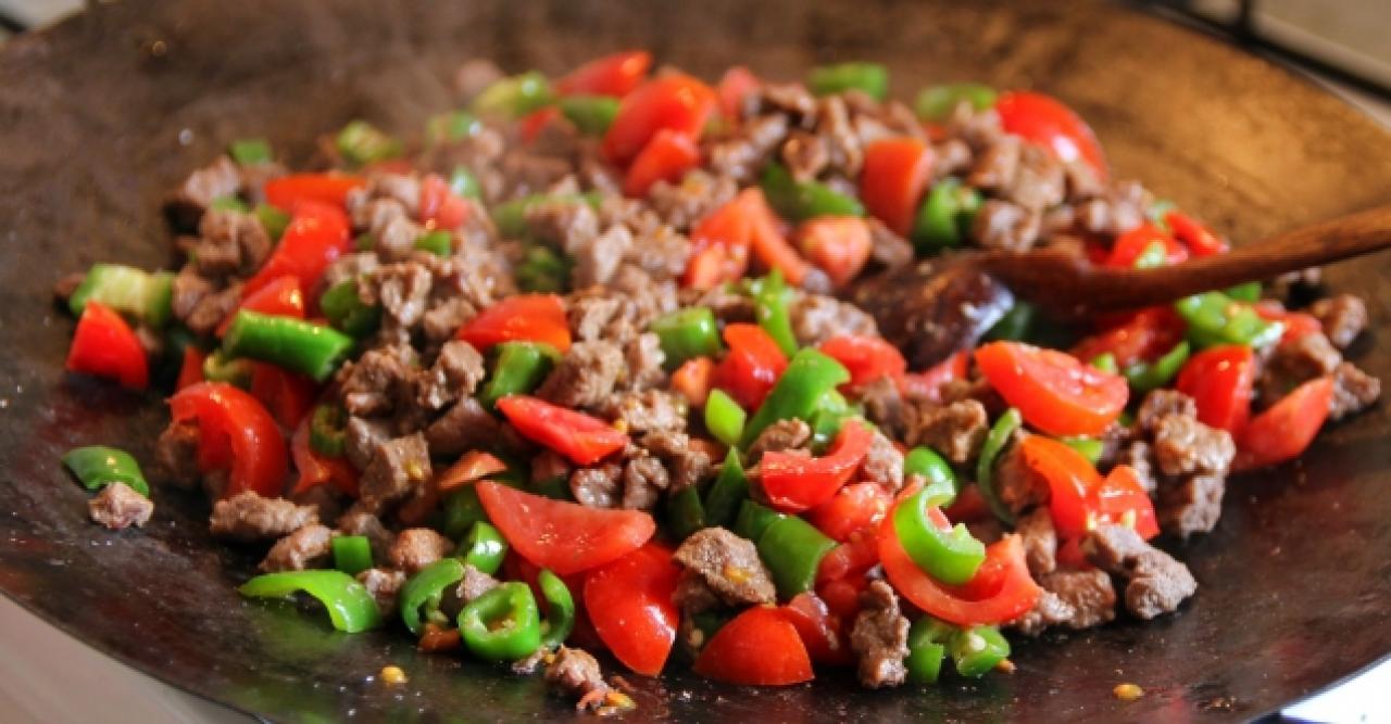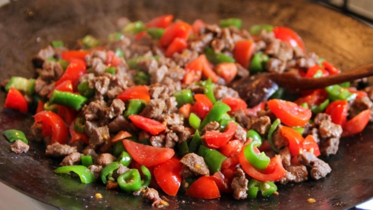 - Soğanlar sotelendikten sonra sivri biberi ve domatesleri tavaya ekleyin. Sac kavurmayı malzemeler tavanın dibine yapışıp yanmaması için ara ara karıştırın. (Not: Karıştırırken dana etinin ezilip dağılmaması için çok dikkatli olun ve eti ezmeden karıştırın.)