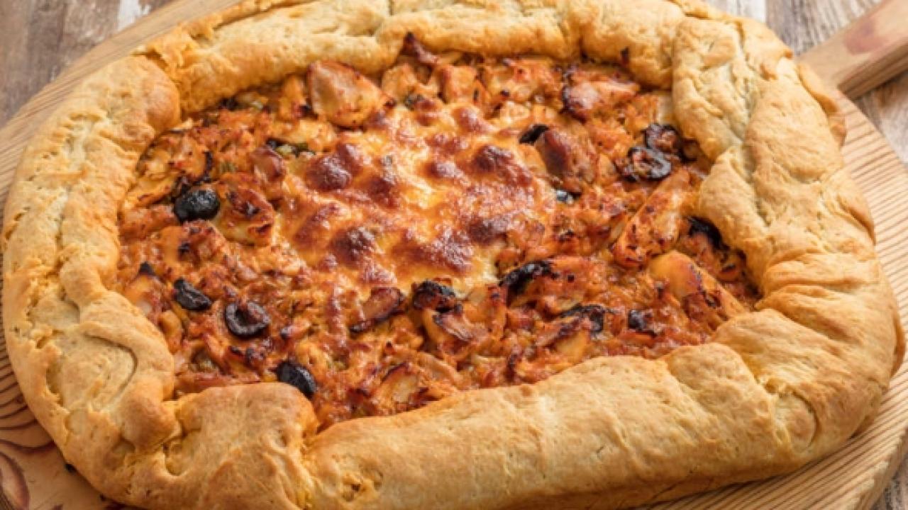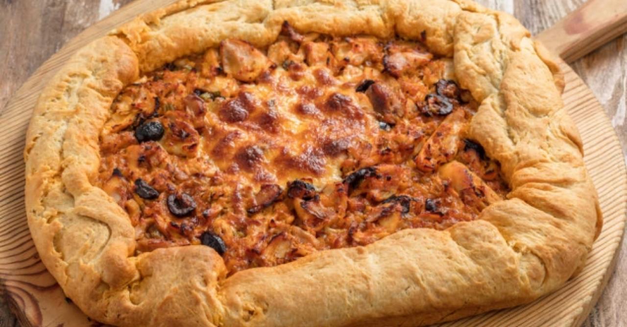 Hamuru için Malzemeler Hamuru 4 eşit bezeye ayırın. 3 tanesini yemek tabağı boyutunda açın. Bir tanesini yemek tabağından daha ince ve büyük olacak şekilde açın. Tabak boyutunda açtığınız hamuru tezgahınıza koyun. Oda sıcaklığındaki tereyağını elinizle iyice hamura yedirin. İkinci ve üçüncü hamuru da aynı şekilde devam edin. En son tepsi boyutunda açtığınız hamuru üzerlerine koyun ve kenarlarındaki fazlalıklarını altına kıvırarak katlayın. Ardından hiç yağ kullanmadan bir merdane yardımıyla fırın tepsinizden biraz daha büyük olacak şekilde açın. Hamurunuzu dörde katlayın, yağlı kağıt serdiğiniz fırın tepsinizin üzerine yerleştirin. Kenarları fırın tepsinizden sarkacak şekilde fırın tepsinize yerleştirin. Hamurunuzun ortasına hazırladığınız tavuklu harcı koyun ve ortası açık kalacak şekilde kenarlarını kapatıp, hamurunuzun üzerine tereyağı sürün. Bir pizza olacakmış gibi düşünebilirsiniz. 180 derecede önceden ısıtılmış fırında 40 dakika pişirin. Fırından almaya 10 – 15 dakika kala çanağın açık kısmına rendelenmiş kaşar peyniri serpiştirin.