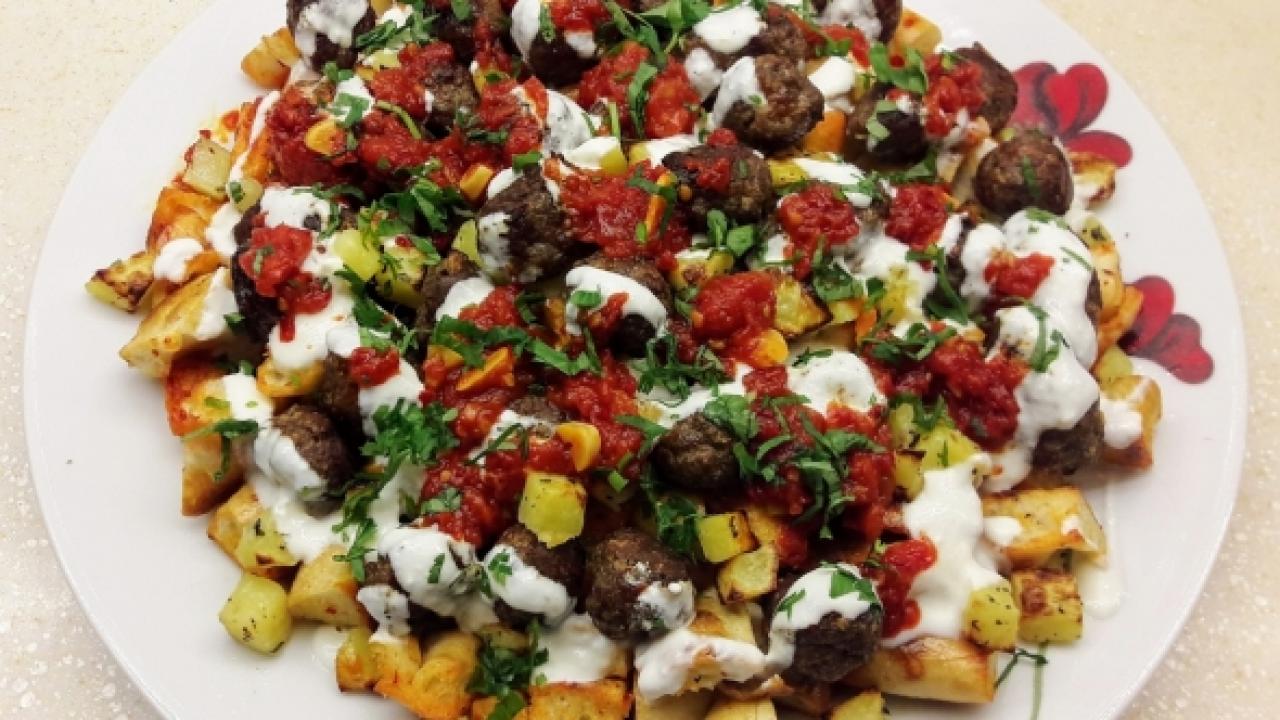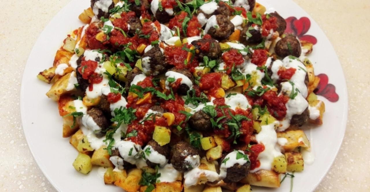 Önce patatesİeri kızartıp servis tabağına üst üste geİecek şekiİde koyun. Köfteleri koyun. Üzerine çırpıİmış yoğurt koyun. Domates ile yağı sarımsağı ateşte öldürün. En üstüne aİacalı şekilde iİave edip sıcak olarak servise sunun.
