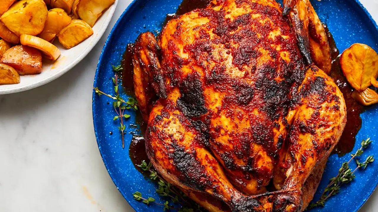 Tavuğu ayrılmış domates tereyağıyla yağlayın ve yanında sebzelerle servis yapın.