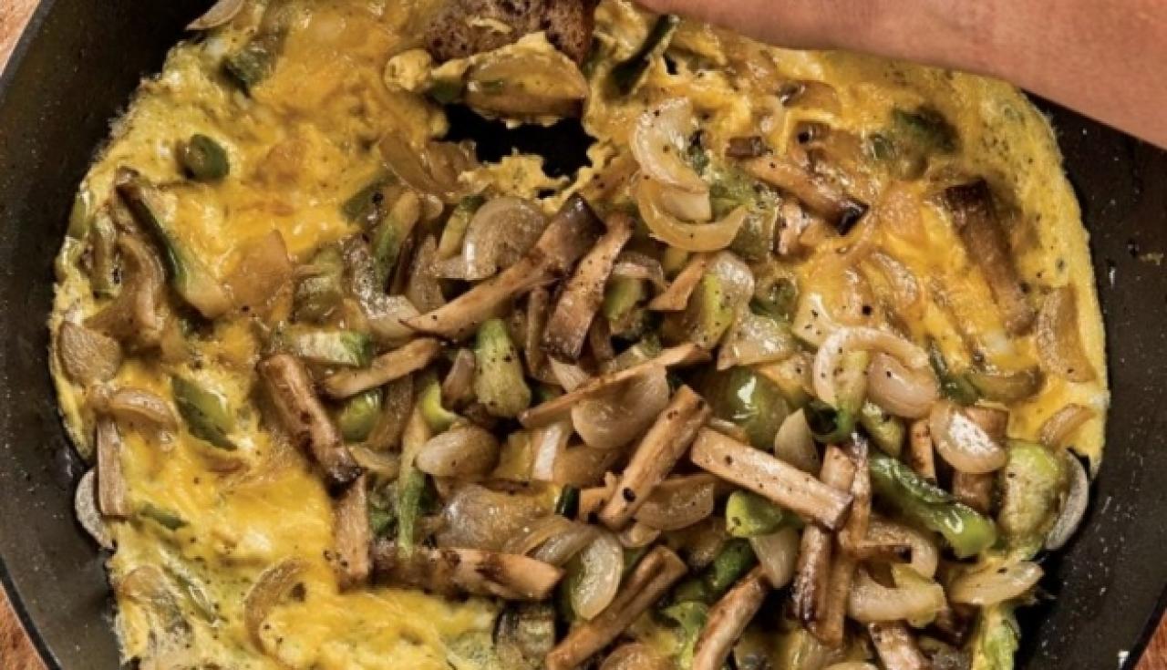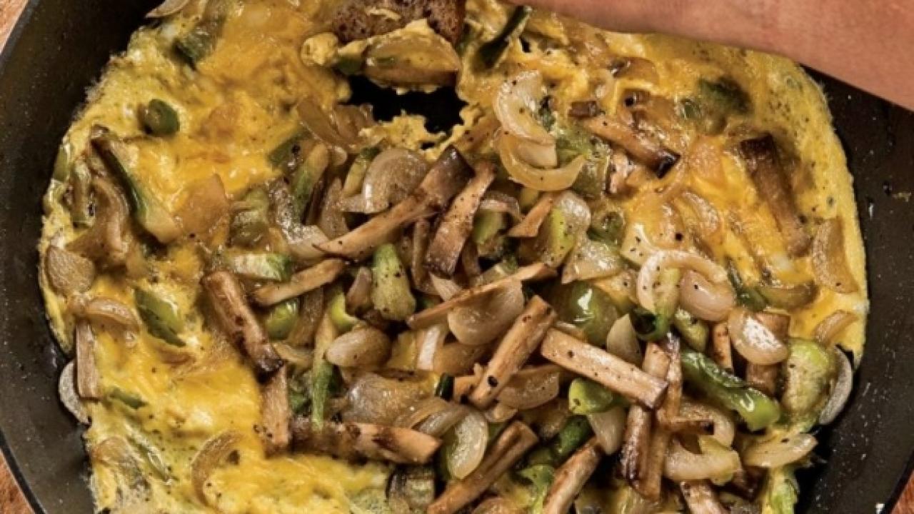 Biber kapaklarındaki tohumları ovalayarak temizleyin. Kalan etli kısmı doğrayıp kenara alın. Zeytinyağını tavaya alıp ısıtın. Jülyen doğranmış soğanı ekleyip rengi dönene dek karıştırarak soteleyin. Biber ve jülyen doğranmış mantar ilave edip yumuşayana dek ara sıra karıştırarak pişirin. Ayrı bir yerde süt ve yumurtaları çırpın. Tavanın bir kenarına gezdirip pişirin. Tuz ve karabiberini ayarlayıp ocaktan alın.
