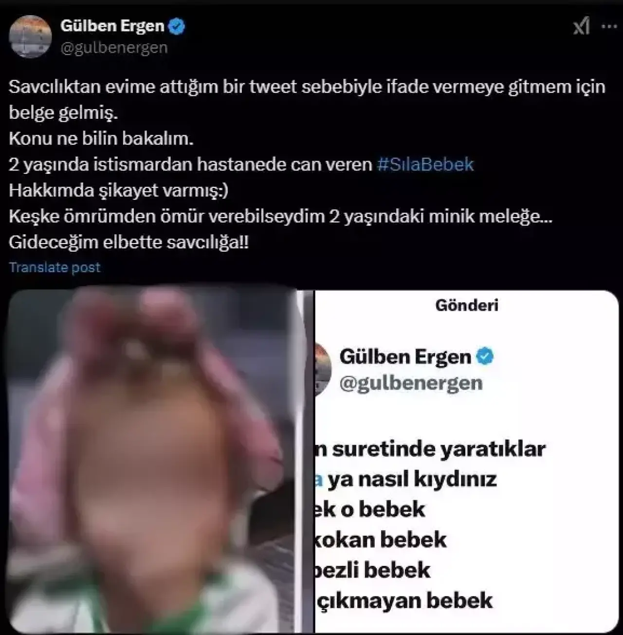 Tekirdağ'da cinsel istismar ve şiddet sonucu hayatını kaybeden Sıla bebek vakası, toplumda şok etkisi yaratmıştı. Vakanın duyulmasının ardından X platformunda (eski adıyla Twitter) bir paylaşım yapan Gülben Ergen, "İnsan suretinde canavarlar, Sıla'ya nasıl kıydınız! O bir bebekti…" sözleriyle tepkisini dile getirmişti. Ancak bu paylaşım, bazı kullanıcılar tarafından şikayet edilmesi üzerine soruşturma kapsamında ele alındı.