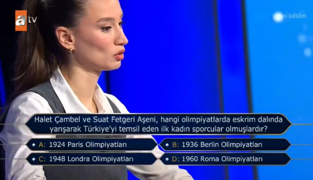Kim Milyoner Olmak İster yarışmasının son bölümünde izleyicilere unutulmaz bir soru soruldu. Bu hafta, yarışmacıya, Türk sporunun önemli isimlerinden olan Halet Çambel ve Suat Fetgeri Aşeni ile ilgili bir soru yöneltildi. Halet Çambel ve Suat Fetgeri Aşeni, 1936 Berlin Olimpiyatları’nda eskrim dalında yarışarak Türkiye’yi temsil eden ilk kadın sporcular olmuşlardır.
