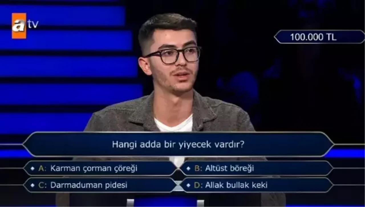 Yarışmacıya sorulan soru şu şekildeydi: Hangi adda bir yiyecek vardır? Verilen seçenekler ise oldukça eğlenceliydi: