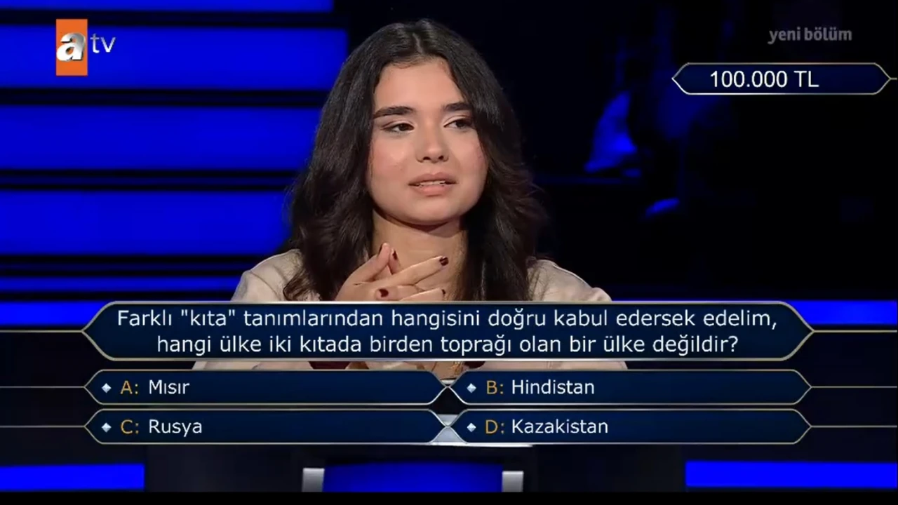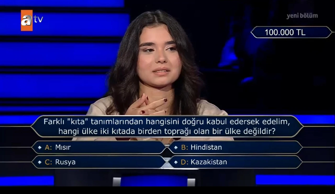 ATV ekranlarında 17 Kasım 2024 Pazar akşamı Kim Milyoner Olmak İster yarışmasında sorulan “Farklı kıta tanımlarından hangisinin doğru kabul edersek edelim hangi ülke iki kıtada birden toprağı olan bir ülke değildir?” sorusunda sorulan A) Mısır, B) Hindistan, C) Rusya, D) Kazakistan şıkları arasında doğru cevap hangisidir?