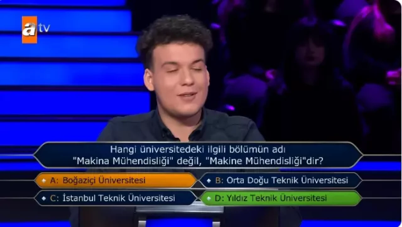 Kim Milyoner Olmak İster yarışmasında sıkça sorulan sorulardan biri, "Hangi üniversitedeki ilgili bölümün adı 'Makina Mühendisliği' değil, 'Makine Mühendisliği'dir?" sorusu oldu. Bu soru, izleyicilerin ve yarışmacıların dikkatini çekerken, doğru cevabın ne olduğu büyük merak konusu oldu. Peki, bu soru ile hangi üniversiteyi kastetmiş olabiliriz? İşte bu sorunun cevabını ve detayları haberimizde bulabilirsiniz.