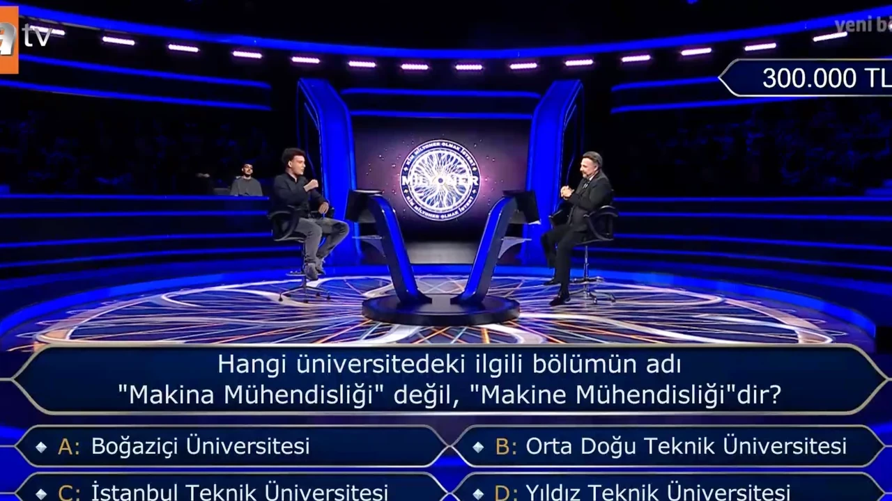 Bu soruya doğru yanıtı veren yarışmacı, 300 bin TL ödül kazanarak büyük bir başarıya imza attı. Peki, "Makina Mühendisliği" yerine "Makine Mühendisliği" teriminin kullanıldığı üniversite hangisi?