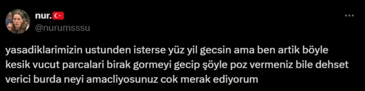 Bazı sosyal medya kullanıcıları, bu tür fotoğrafların rahatsız edici olduğunu belirterek tepki gösterdi. Özellikle kadın cinayetleri gibi hassas konuların toplumsal gündemde yoğun olarak konuşulduğu bir dönemde, parçalanmış manken uzuvları arasında poz vermenin duyarsızlık olarak algılandığı yorumları yapıldı. Bazı takipçiler ise fotoğrafın sanatsal bir ifade olduğunu savunarak eleştirilerin haksız olduğunu dile getirdi.