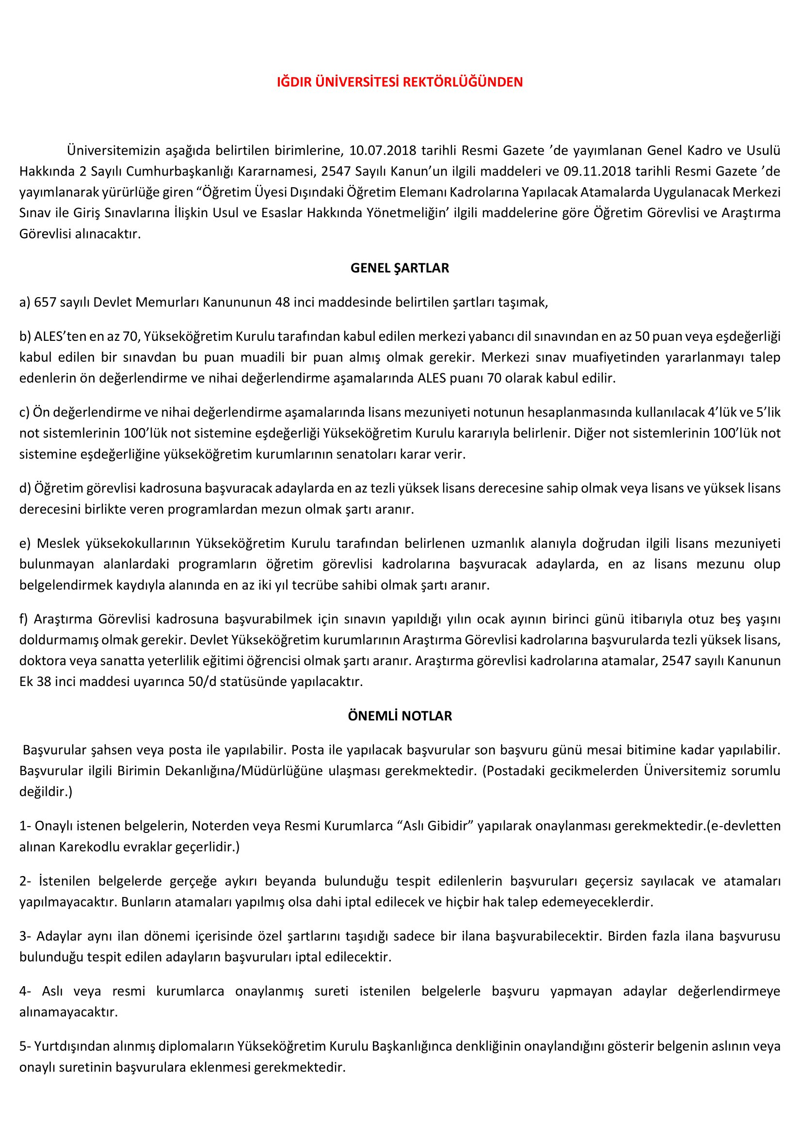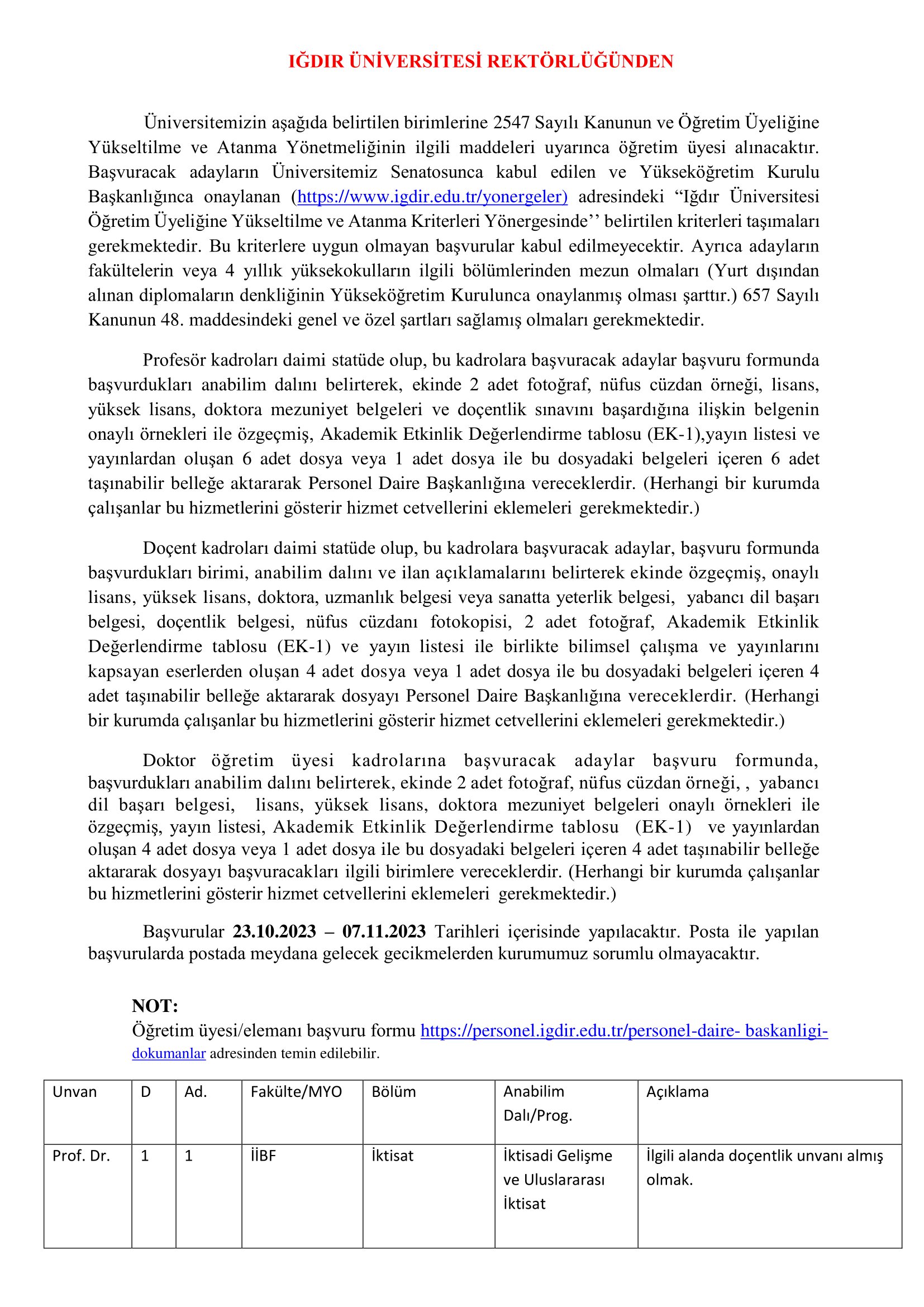 Iğdır Üniversitesi 40 öğretim üyesi alacak. Başvurular 23 Ekim 6 Kasım tarihleri arasında gerçekleşecektir.