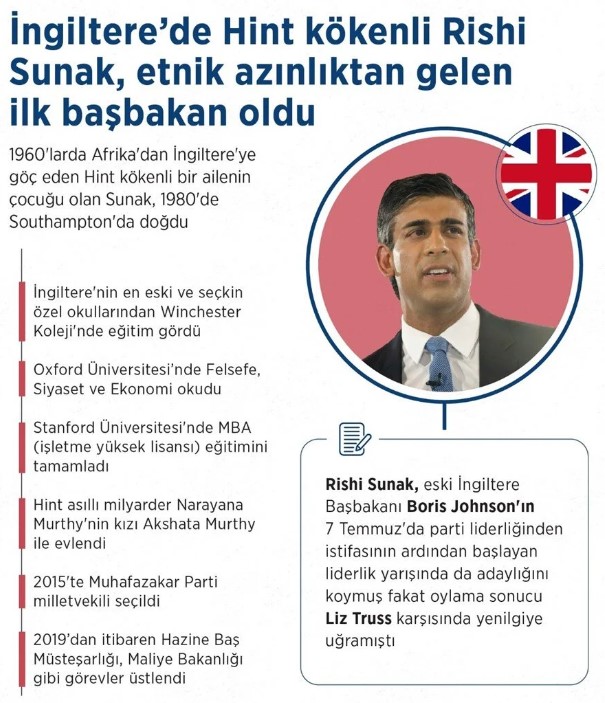 Ülkede 20 Ekim'de parti liderliğinden istifa eden Başbakan Liz Truss'ın yerini almak için mücadele veren eski Maliye Bakanı Sunak, liderlik yarışını kazandı.