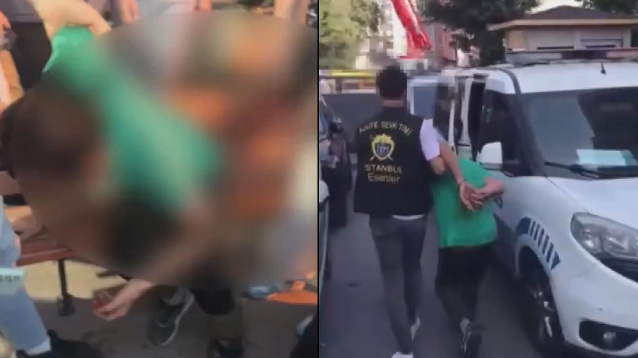 Görüntülerde bank üzerine oturtulan şahsın, kafasına tekme ve yumruklarla saldırıldığı görüldü.
