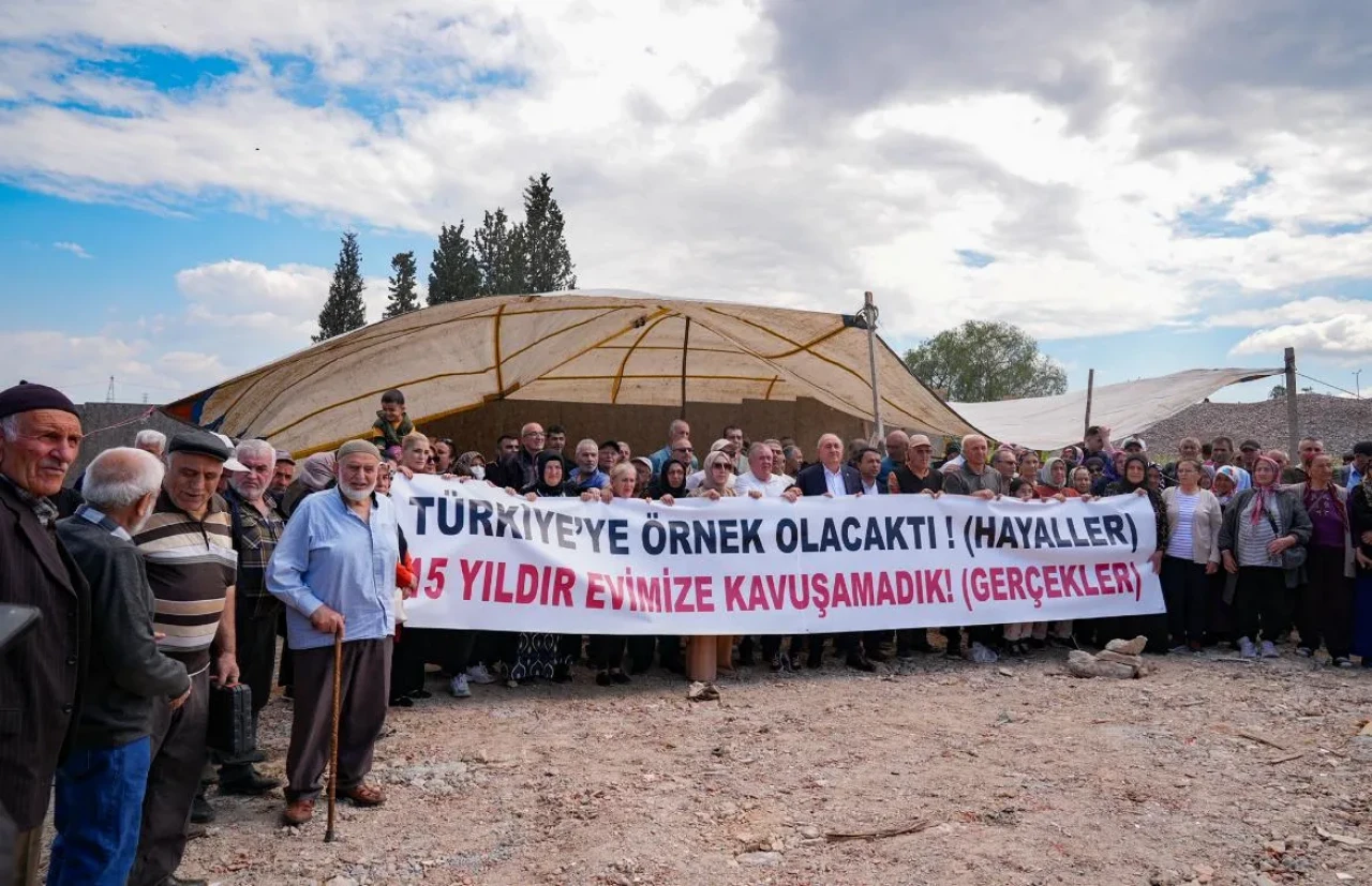 Hak sahipleri, yıkılan evlerinin arazisine çadır ve barakalar kurarak yaşama mücadelesi başlattı. İzmir Büyükşehir Belediye Başkanı Cemil Tugay'dan sürecin hızlandırılmasını isteyen vatandaşlar, süregelen mağduriyetlerini dile getirdi.