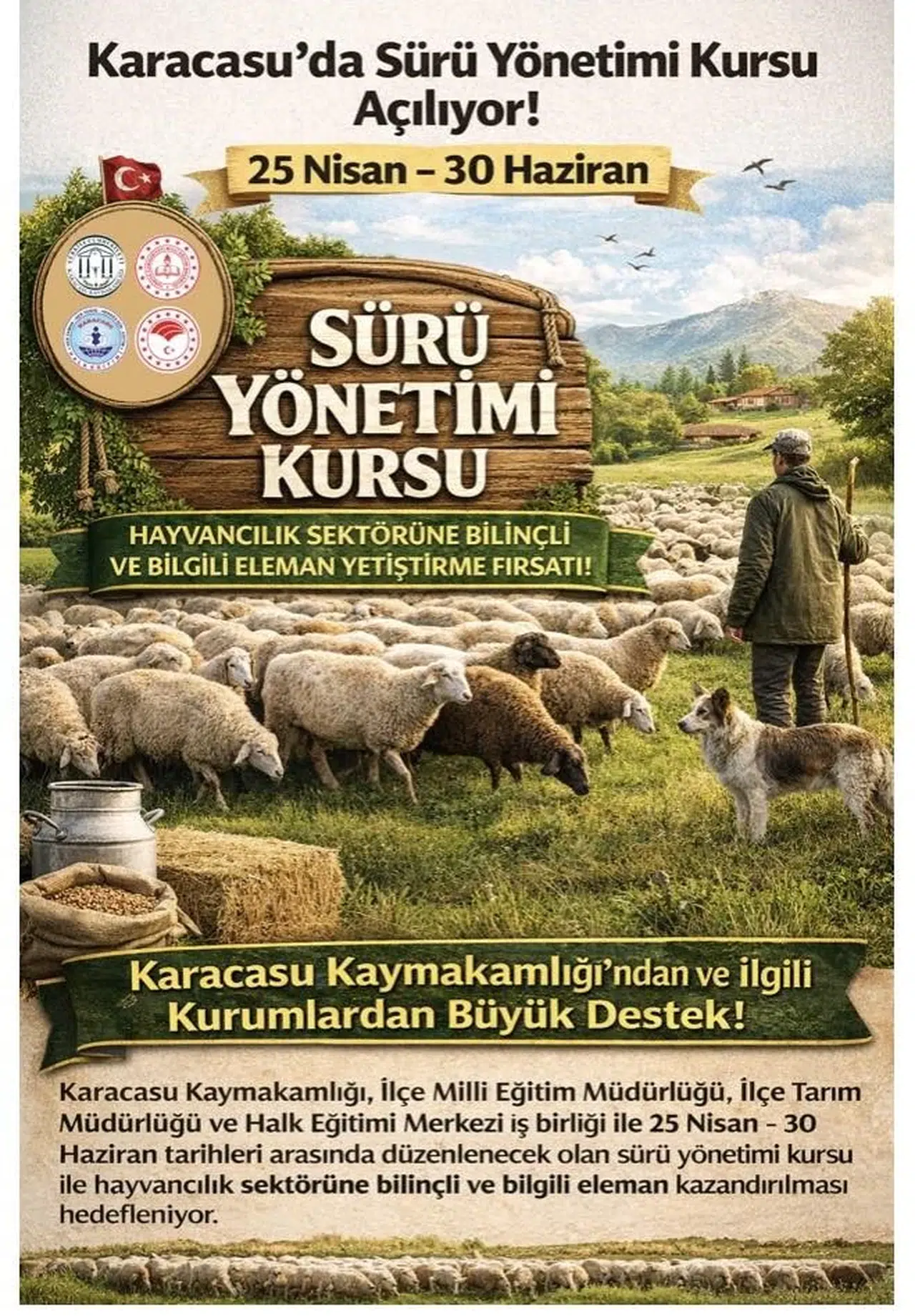Karacasu Kaymakamlığı koordinasyonunda; İlçe Milli Eğitim Müdürlüğü, İlçe Tarım Müdürlüğü ve Halk Eğitimi Merkezi'nin ortaklaşa düzenlediği Sürü Yönetimi Kursu, bölgedeki hayvancılık faaliyetlerini profesyonel bir seviyeye taşımayı hedefliyor. 25 Nisan ile 30 Haziran 2026 tarihleri arasında gerçekleştirilecek olan program, modern hayvancılık tekniklerini yerel üreticilerle buluşturacak.