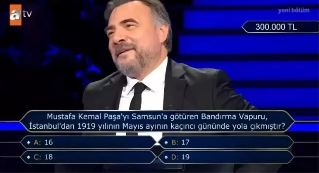 ATV ekranlarında yayınlanan popüler bilgi yarışması Kim Milyoner Olmak İster'in son bölümü, tarihi sorularıyla dikkat çekmeye devam ediyor. Yarışmanın son bölümünde yarışmacıya, Türkiye Cumhuriyeti tarihinin en önemli olaylarından biri hakkında bir soru yöneltildi: "Mustafa Kemal Paşa'yı Samsun'a götüren Bandırma Vapuru, İstanbul'dan 1919 yılının Mayıs ayının kaçıncı gününde yola çıkmıştır?"