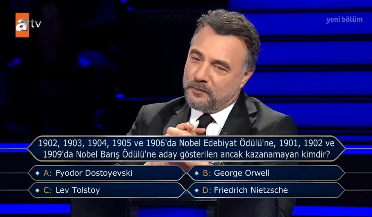 Kim Milyoner Olmak İster yarışmasında 300 bin TL'lik soruda sorulan “Nobel Barış Ödülü'ne aday gösterilen ancak kazanamayan kimdir?” sorusunun yanıtı vatandaşlar tarafından merak ediliyor. Peki doğru cevap nedir?