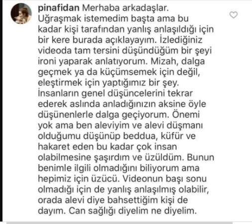 Tepkilerin ardından özür dileyen ve ironi yaptığın belirten Fidan, kendisinin de Alevi olduğunu, gösterisinde bahsettiği kişinin ise dayısı olduğunu ileri sürdü.