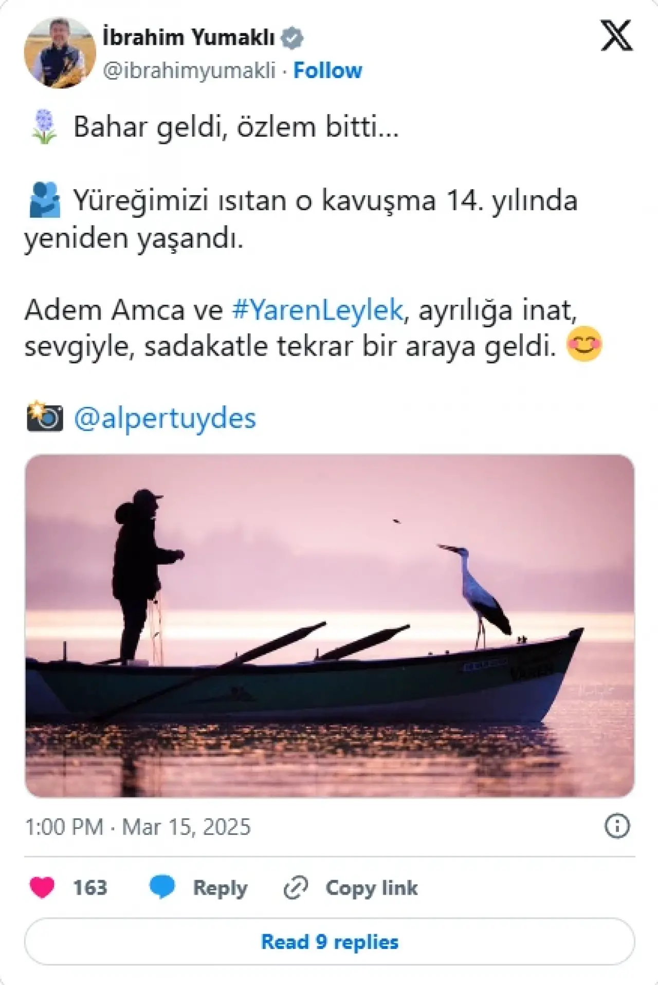 "Bahar geldi, özlem bitti. Yüreğimizi ısıtan o kavuşma 14. yılında yeniden yaşandı. Adem Amca ve Yaren leylek, ayrılığa inat, sevgiyle, sadakatle tekrar bir araya geldi."