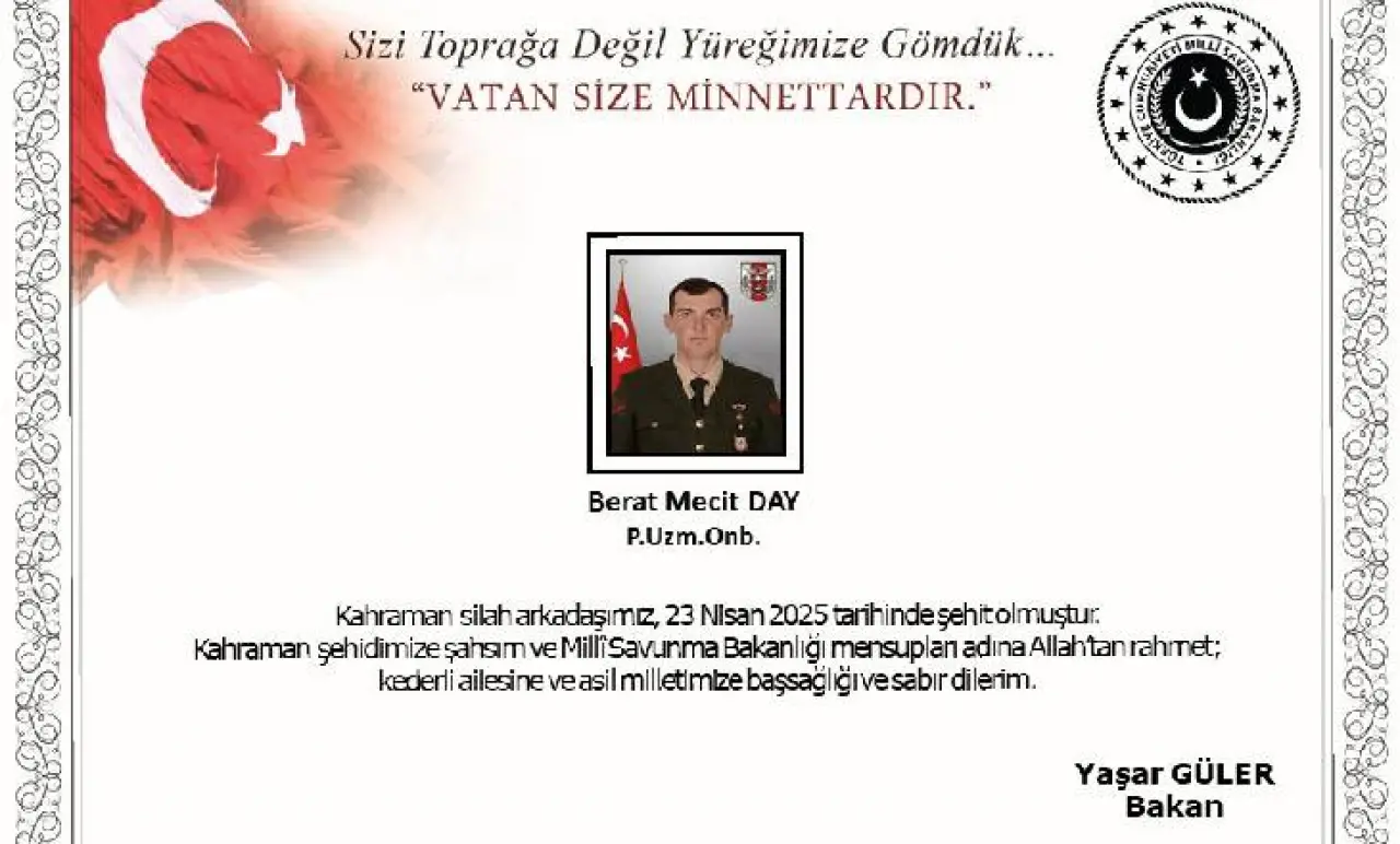 Milli Savunma Bakanlığı (MSB), 22 Nisan 2025 tarihinde hain terörist unsurlar tarafından gerçekleştirilen saldırıda ağır yaralanan Piyade Uzman Onbaşı Berat Mecit Day’ın, tüm tıbbi müdahalelere rağmen kurtarılamayarak 23 Nisan’da şehit olduğunu bildirdi.