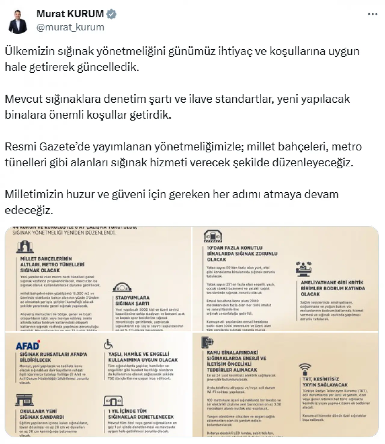 “Ülkemizin sığınak yönetmeliğini günümüz ihtiyaç ve koşullarına uygun hale getirerek güncelledik. Mevcut sığınaklara denetim şartı ve ilave standartlar, yeni yapılacak binalara önemli koşullar getirdik. Milletimizin huzur ve güveni için gereken her adımı atmaya devam edeceğiz.”