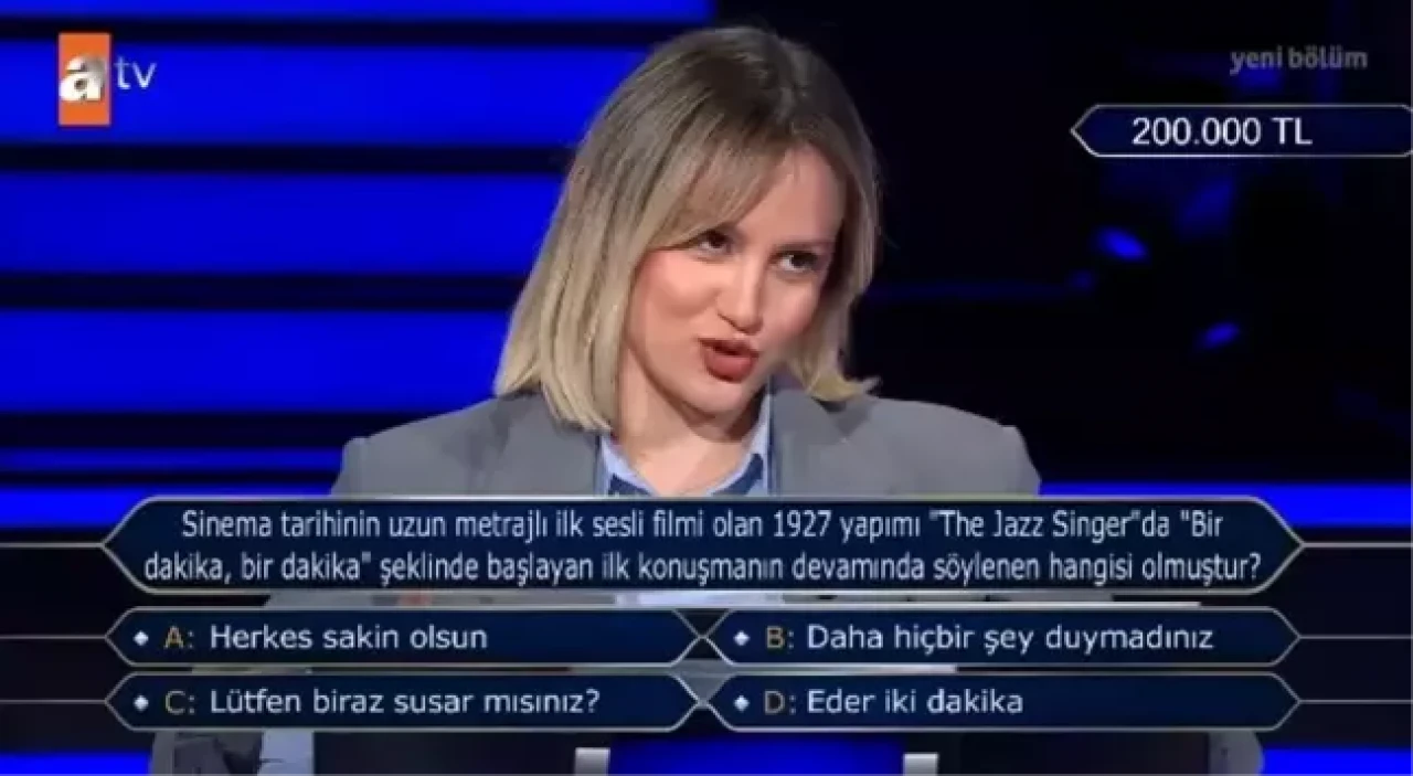 Kim Milyoner Olmak İster yarışmasında, izleyicilere "The Jazz Singer" filmindeki ünlü "Bir dakika, bir dakika" repliği soruldu. Bu soru, yarışma severlerin sinema bilgilerini test etmeyi amaçlarken, aynı zamanda sinema tarihine olan ilgiyi artırdı. İşte sorunun seçenekleri: