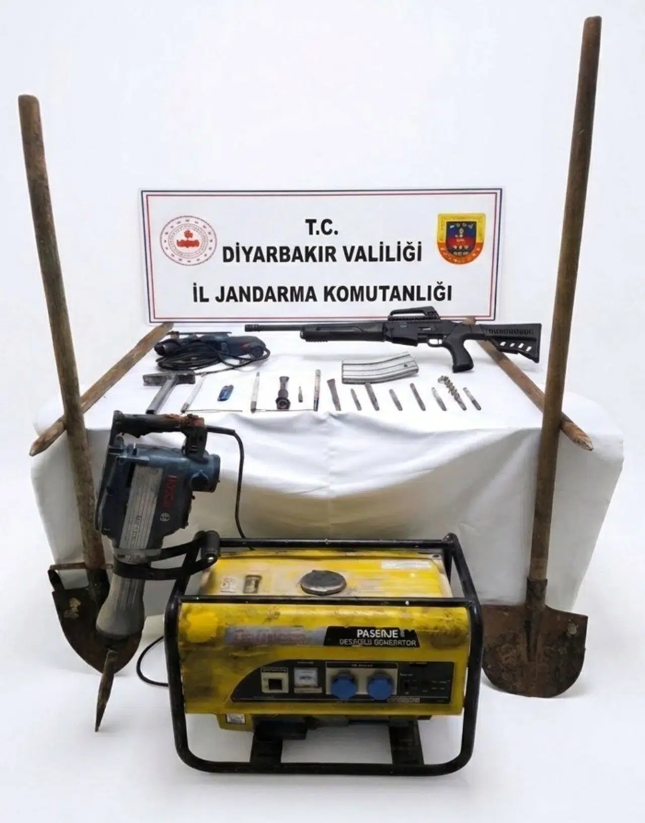 Operasyon kapsamında yapılan aramalarda, define avcılarının profesyonel ekipmanlarla hazırlık yaptıkları ortaya çıktı. Olay yerinde; bir adet jeneratör, matkap, dokuz adet matkap ucu, alan tarama çubuğu, levye, kürek, çekiç, keski ve elektrik tesisatı için kullanılan kablolar ele geçirildi.