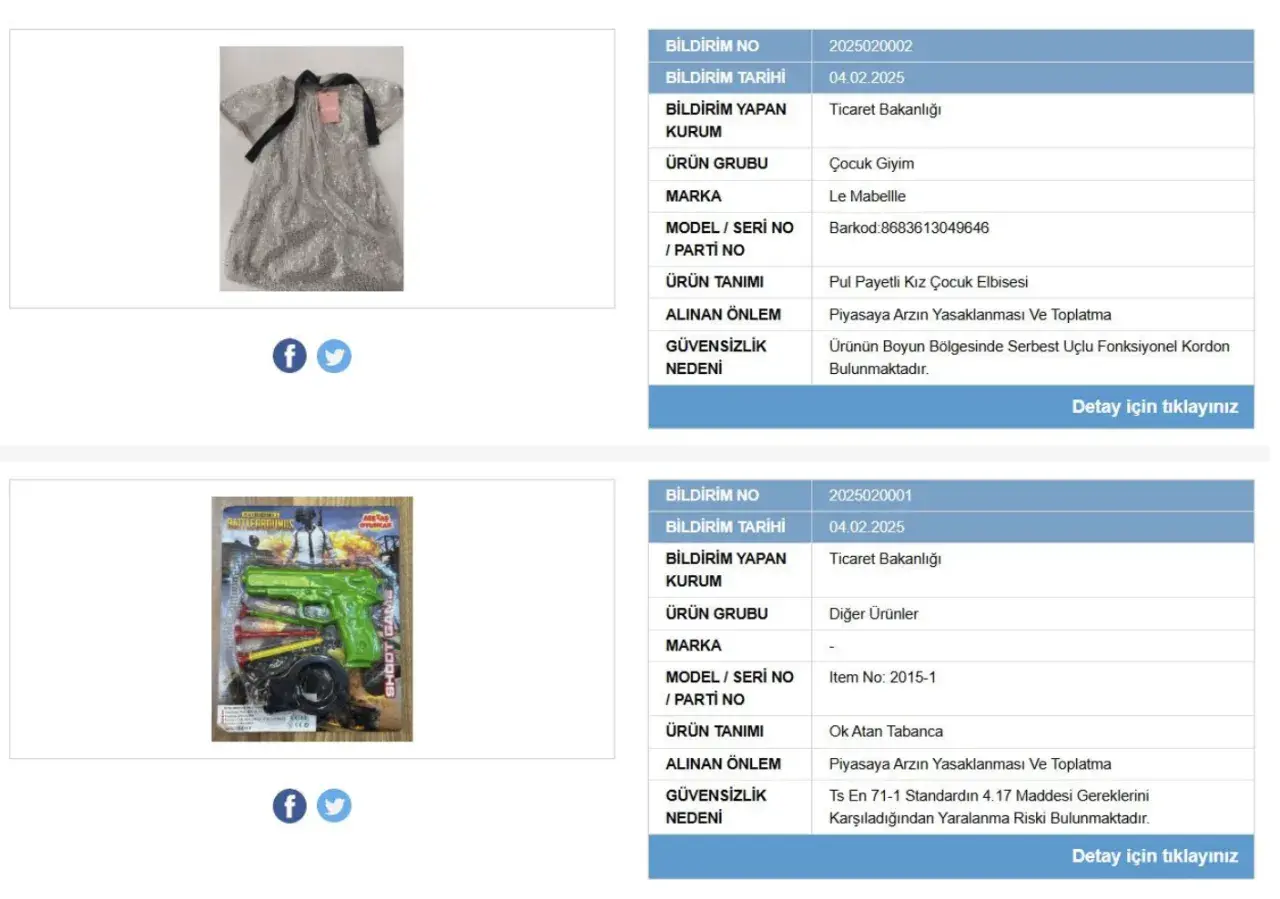 Ticaret Bakanlığı, Güvensiz Ürün Bilgi Sistemi üzerinden bazı çocuk giyim ve oyuncak ürünlerinin sağlık riski taşıdığını duyurdu. Bu ürünlerin kullanımı yasaklanarak piyasadan toplatılmasına karar verildi.